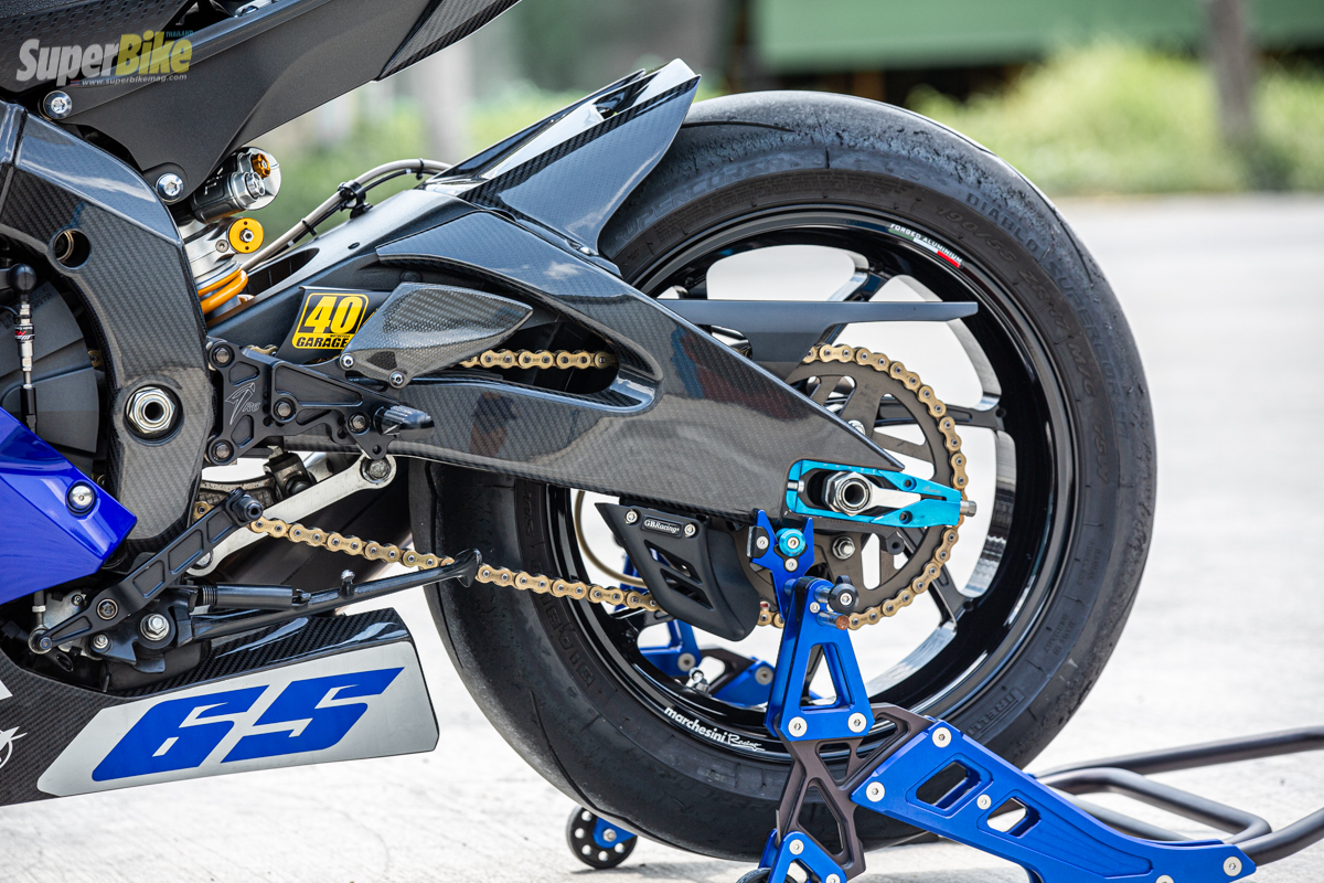 สำหรับคันนี้เรามาเริ่มกันที่แฟริ่งชุดสีภายนอกกันก่อนเลยดีกว่า ที่ยังคงเป็นชุดเดิมบางชิ้นส่วนแต่บางชิ้นถูกเปลี่ยนเป็นคาร์บอนเคฟลาร์ที่ขึ้นรูปใหม่เป็นแบบเพียวคาร์บอน เบากว่าเดิมแน่นอนอย่างครอบเฟรม อกล่าง ครอบสวิงอาร์ม อันเดอร์เทล ที่ให้ทาง RPM Carbon เป็นคนจัดการให้ และยังมี ชิ้นส่วนของบังโคลนหน้า ตัวดักลมคาลิบเปอร์เบรกหน้า และ ครอบถังน้ำมันที่ให้ทาง 40 Garage เป็นคนจัดการ แต่ง Yamaha R6 ให้อย่างสวยงามลงตัว