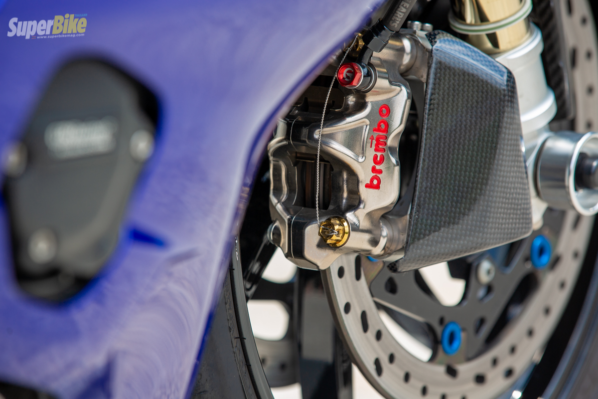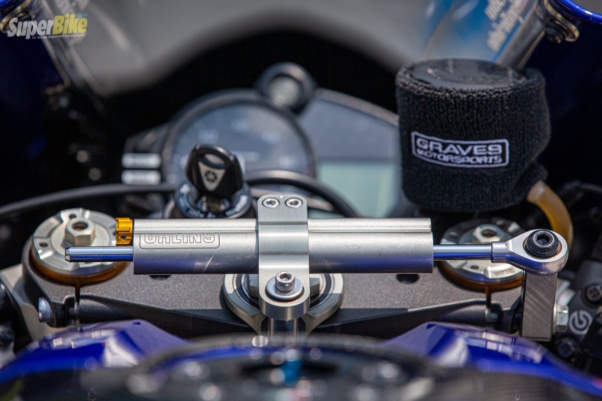มาดูชุดบนด้านหน้าที่ใส่มามาให้แบบเต็มระบบไม่แพ้ด้านล่าง โดยใส่ปั๊มเบรกหน้าเป็น Brembo RCD Italy เบอร์ 19 ใส่ตัวปรับระยะก้านเบรกไว้ด้วยเพื่อที่จะใช้ปรับระยะขณะขับขี่ได้ มีประโยชน์ต่อการขับขี่ในสนาม กันกระแทกด้วยการ์ดแฮนด์ ประกับทดรอบจาก GRAVES ฝั่งซ้ายก้านคลัตช์ใส่เป็นของ Brembo Italy และยังมีกลางแผงคอด้านบนที่ใส่ตัวกันสะบัด Ohlins ไว้ใช้ยามจำเป็น ดีไซน์ขาจับสวยงามลงตัว
