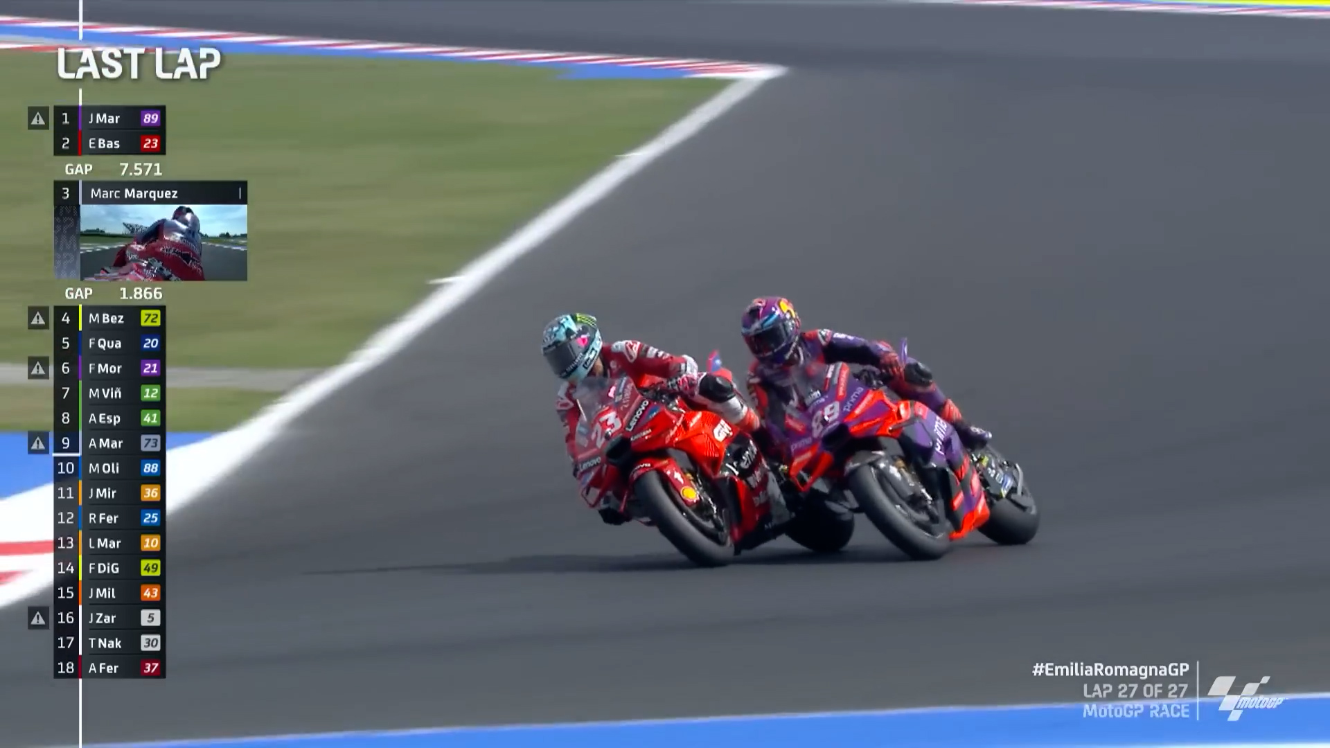 การแข่งขัน Emilia-Romagna GP มอบดราม่าให้เราแบบเต็มเปี่ยม โดย Enea Bastianini (ทีม Ducati Lenovo) คว้าชัยชนะอย่างยอดเยี่ยมหลังจากแซงผู้นำคะแนนสะสม Jorge Martin (ทีม Prima Pramac Racing) ในช่วงท้าย ขณะที่ Pecco Bagnaia (ทีม Ducati Lenovo) พลาดล้มในการแข่งขัน GP ครั้งที่ 100 ของเขา