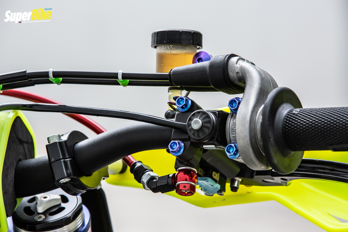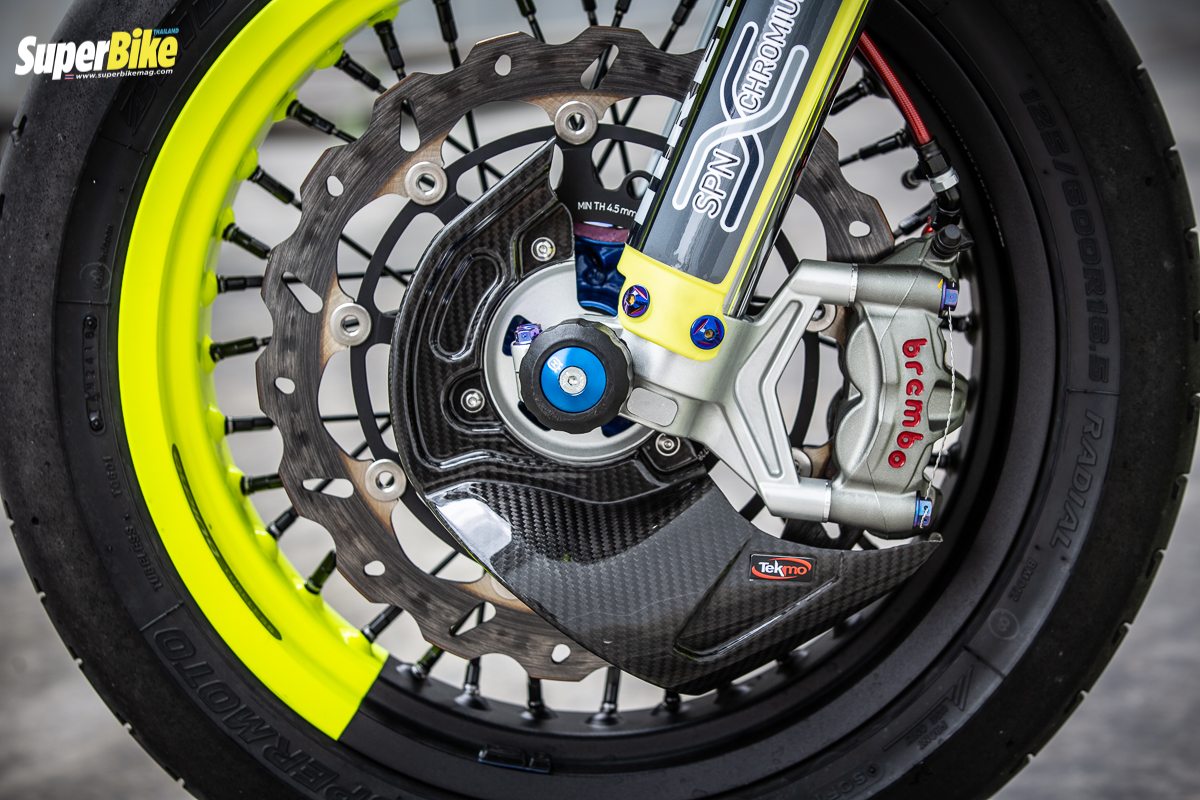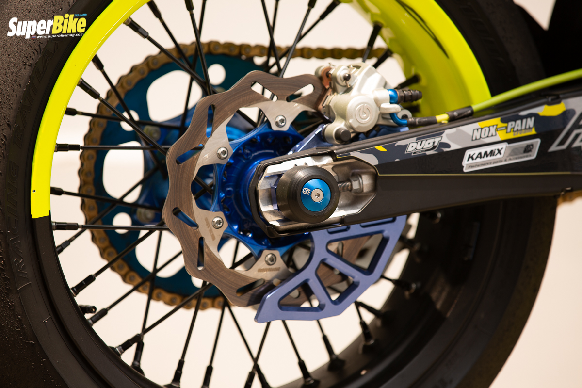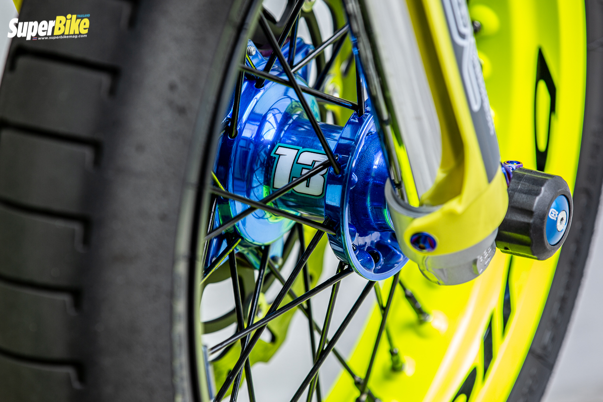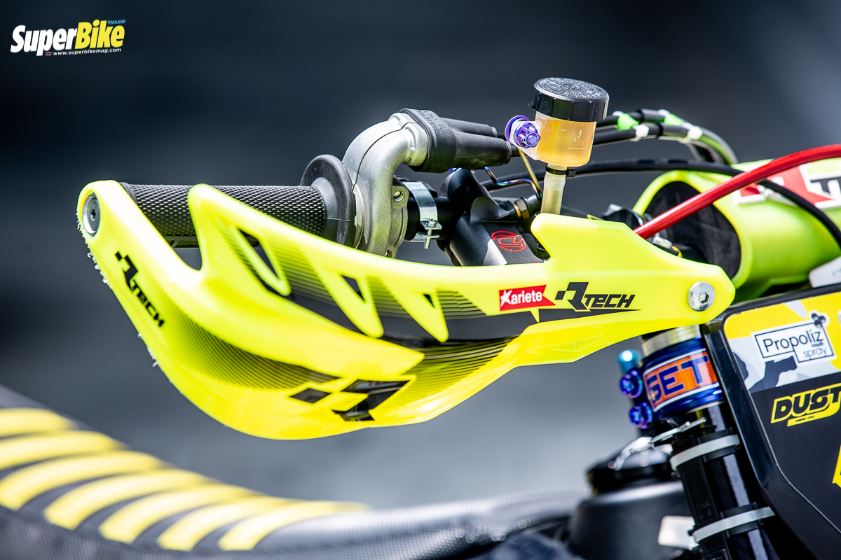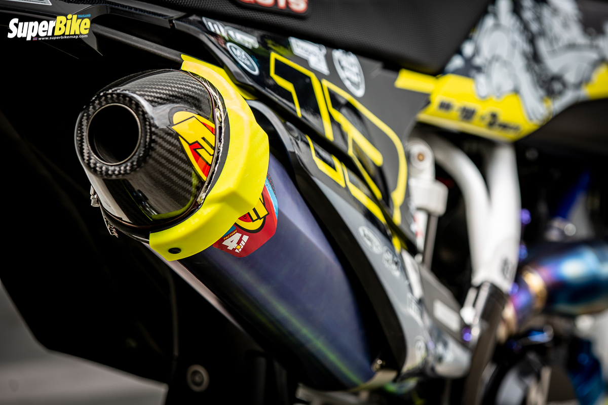 ก็คือแต่งออกมาในสไตล์ของตัวเองน่ะครับในส่วนของลวดลาย แล้วก็ของที่ใช้ก็เน้นของตรงรุ่นตรงสายซูเปอร์โมโต ก็จะมีลวดลายสติ๊กเกอร์ที่แบรนด์ของสปอนเซอร์เป็นการขอบคุณพวกเขาด้วย ส่วนของแต่งที่อาจจะแต่งเพิ่มในอนาคต ก็อาจจะใส่กล่องไฟเพิ่มความแรงในอนาคต แต่ตอนนี้ก็แรงพอหอมปากหอมคอแล้ว เราก็ไม่ได้ขี่มากแล้ว คิดว่าน่าจะสุดทางแล้วตอนนี้