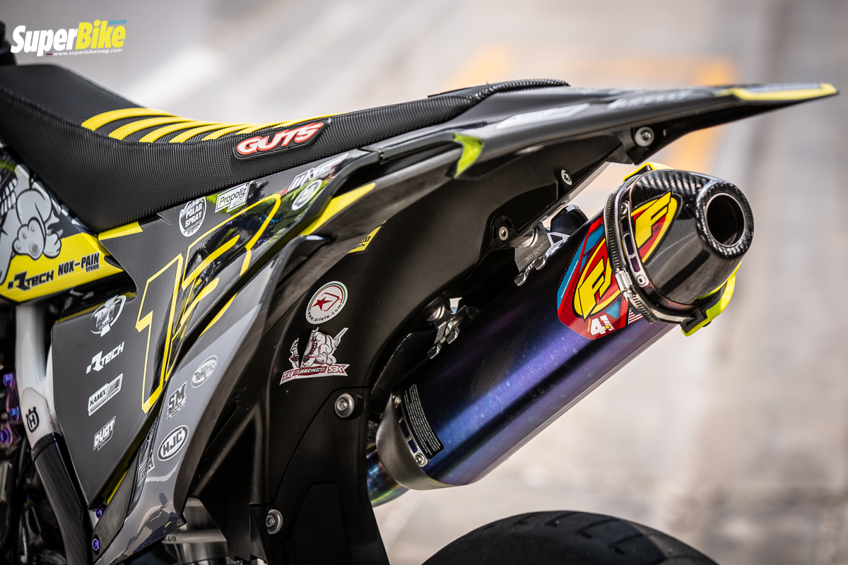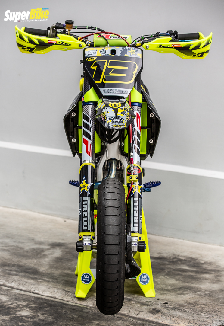 พวกชิ้นส่วนสีโครเมียมผมก็เลือกใช้ SPN Chromium ส่งไปทำสีกับทางนั้น ยางผมก็เลือกใช้แต่ Pirelli เท่านั้น ผ้าหุ้มเบาะ Guts ตัวพิเศษที่มีโลโก้ Husqvarna เลย หมวกที่ใช้ก็ HJC ก็อกเกิ้ลก็ Ariete ซึ่งผมได้สปอนเซอร์จาก Kamix Shop โดยคุณดาร์ท ปั๊มเบรกก็ร้านนี้เช่นกันเป็นก้านสั้นสำหรับซูเปอร์โมโตของ Discacciati คลัตช์ของ Husqvarna สายเบรก Earl มีปลดเร็ว Venhill ซึ่งเป็นของเหลืออยู่ ปกติไม่มีใครใส่เท่าไหร่ มีฝาถังแต่ง แผงคอแต่ง ในส่วนของท่อจะเป็นของ fmf carbon titanium แบบ full system จาก Outstock Products ให้พลังเสียงสุดยอด แถมยังช่วยในเรื่องความแรงอีกด้วย