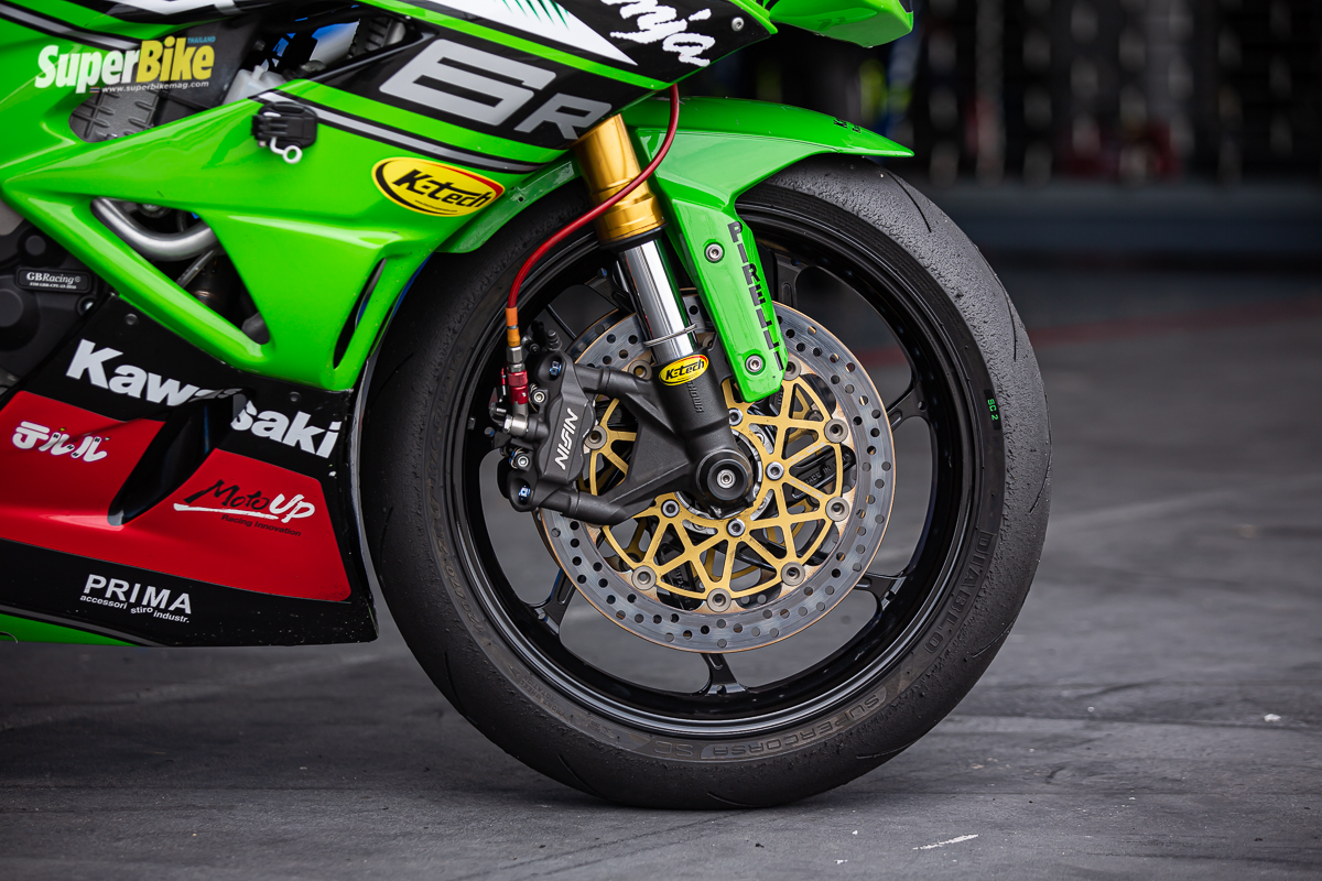 โดยเลือกใช้โช้คอัพหน้าและหลังจาก K-Tech Suspension UK ประเทศอังกฤษ ที่โด่งดังในการแข่งขันที่ TT Isle of man โช้คอัพหน้า K-Tech รุ่น DDS จานเบรกหน้า Brembo Supersport 320mm ส่วนระบบเบรกจะเป็นเบรกเดิมของ ZX-6R นั้นถือว่าใช้งานได้ดี โดยเปลี่ยนสายเบรก Hel เป็นแบบไม่มี ABS ทั้งหน้าและหลัง ผ้าเบรกหน้า Brenta Racing Carbon ล้อ Marchesini M7 ยางแบรนด์ยอดฮิต Pirelli Diablo Supercorsa SC V3  120/70 SC2