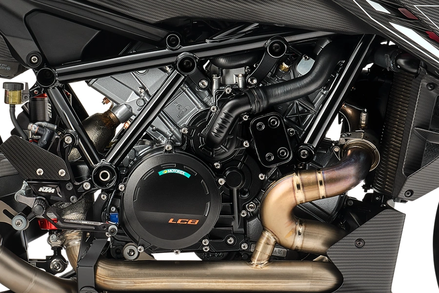 เครื่องยนต์ V-Twin LC8 ขนาด 1,350 ซีซี อันเลื่องชื่อของ KTM ได้ถูกอัปเกรดไส้ในใหม่สำหรับปี 2026 โดยในรุ่น 2026 KTM 1390 Super Duke RR TRACK สามารถรีดพละกำลังสูงสุดออกมาได้ถึง 198 แรงม้า (PS) และแรงบิดมหาศาล 145 นิวตันเมตร ซึ่งพละกำลังทั้งหมดนี้ถูกถ่ายทอดผ่านระบบเกียร์แบบ Race-shift และระบบท่อไอเสีย Akrapovic Full System แบบ Titanium ที่ออกแบบมาเพื่อรีดแรงม้าในช่วงรอบปลายโดยเฉพาะ