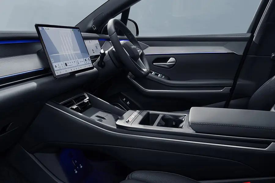 ภายในห้องโดยสารของ BYD SEALION 8 อาจเข้าไทย จะอัดแน่นด้วยออปชั่นระดับพรีเมียมที่เป็นมาตรฐานใหม่ของ BYD วัสดุตกแต่งส่วนใหญ่เป็นหนังสังเคราะห์และ Soft-touch คุณภาพสูง มาพร้อมหน้าจออินโฟเทนเมนต์ขนาด 15.6 นิ้วที่หมุนได้ และหน้าจอแสดงผลบนกระจกหน้า (Head-up Display) ขนาดใหญ่ถึง 26 นิ้วที่แสดงข้อมูลครบถ้วนโดยไม่ต้องละสายตาจากถนน