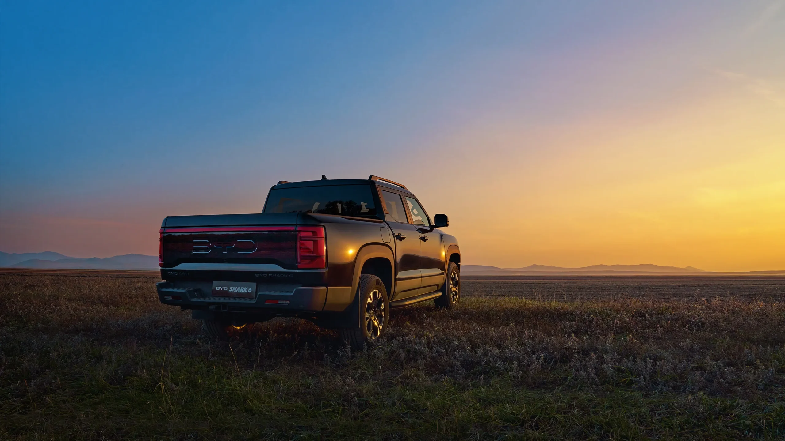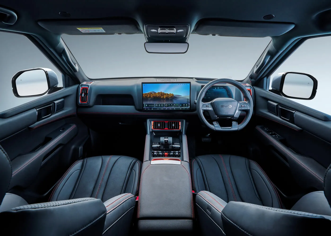 ด้วยมิติตัวถังยาว 5,457 มม. กว้าง 1,971 มม. และสูง 1,925 มม. ทำให้ BYD SHARK 6 มีขนาดใหญ่กว่าทั้ง Ford Ranger และ Toyota Hilux Revo ในบางมิติ มอบรูปลักษณ์ที่ดุดันด้วยไฟหน้า LED รูปตัว C และกระจังหน้าประทับตรา BYD ขนาดใหญ่ ภายในห้องโดยสารล้ำสมัยด้วยหน้าจอสัมผัสขนาด 12.8 นิ้วที่หมุนได้เป็นเอกลักษณ์ พร้อมหน้าจอ Head-up Display ขนาด 12 นิ้ว
