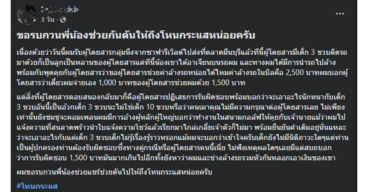 ผู้ปกครองรับผิดชอบเด็ก กลายเป็นกระแสวิพากษ์วิจารณ์อย่างหนักในโลกโซเชียล เมื่อพนักงานขับรถรับจ้างสาธารณะรายหนึ่งออกมาโพสต์ขอความช่วยเหลือผ่านกลุ่มเฟซบุ๊ก เพื่อขอให้ช่วยกันดันเรื่องไปถึงรายการดังอย่าง “โหนกระแส” หลังจากที่เขาต้องเผชิญกับพฤติกรรมสุดช้ำใจของผู้โดยสารที่ปฏิเสธการจ่ายค่าเสียหายกรณีเด็กอาเจียนบนรถ โดยอ้างเหตุผลว่า “เด็กยังเล็กไม่รู้ความ” และตั้งคำถามกลับถึงความมีน้ำใจของคนขับ