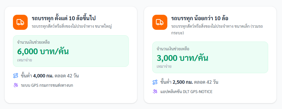 สำหรับกลุ่มรถบรรทุกถือเป็นหัวใจของการขับเคลื่อนเศรษฐกิจ อย่างไรก็ตาม การจ่ายเงินช่วยเหลือจะมุ่งเน้นไปที่รถบรรทุกที่ขนส่งสินค้าอุปโภคบริโภคจำเป็นเท่านั้น เนื่องจากรัฐบาลต้องการควบคุมราคาสินค้าในท้องตลาดไม่ให้พุ่งสูงขึ้น เพราะฉะนั้น ผู้ประกอบการต้องแสดงเอกสารการขนส่งและประเภทของสินค้าที่ชัดเจน รวมถึงต้องจดทะเบียนเป็นรถขนส่งเชิงพาณิชย์อย่างถูกต้องตามกฎหมาย