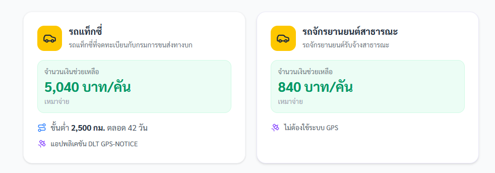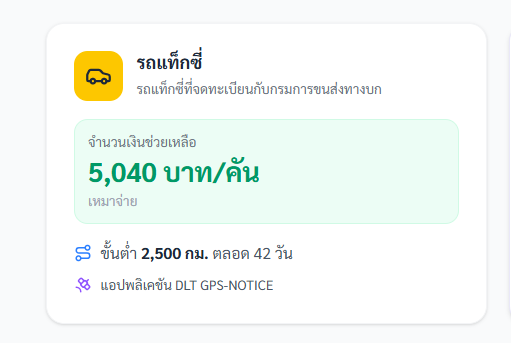 ในส่วนของคนขับแท็กซี่นั้น คุณสมบัติเบื้องต้นคือต้องเป็นรถแท็กซี่ที่จดทะเบียนในเขตกรุงเทพฯ และปริมณฑล หรือในจังหวัดท่องเที่ยวที่มีการควบคุมราคา เพราะว่ากลุ่มนี้มีต้นทุนการดำเนินงานที่สูงกว่าทั่วไป นอกจากนี้ รถต้องมีการติดตั้งมิเตอร์และผ่านการตรวจสอบสภาพตามรอบปีจากกรมการขนส่งทางบกที่ชัดเจน โดยการช่วยเหลือจะเน้นไปที่การลดค่าก๊าซ NGV หรือส่วนลดน้ำมันตามประเภทการใช้งาน