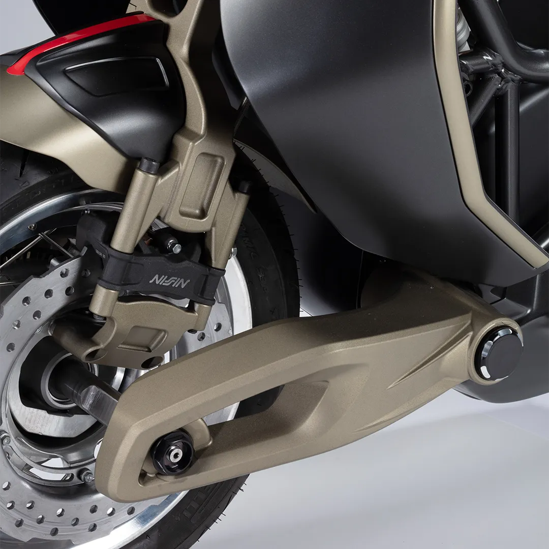 • ระบบกันสะเทือนหน้า-หลัง จาก Öhlins: โดดเด่นด้วยระบบช่วงล่างหน้าแบบสวิงอาร์มแขนเดี่ยว (Linkage-actuated leading arm) อันเป็นเอกลักษณ์ ทำงานร่วมกับโช้คอัพ Öhlins ที่สามารถปรับเซ็ตค่าได้อย่างละเอียด ส่วนด้านหลังเป็นโช้คอัพ Öhlins แบบปรับได้เช่นกัน ช่วยให้การซับแรงกระแทกและการแบนโค้งนิ่งสนิทราวกับรถสปอร์ต