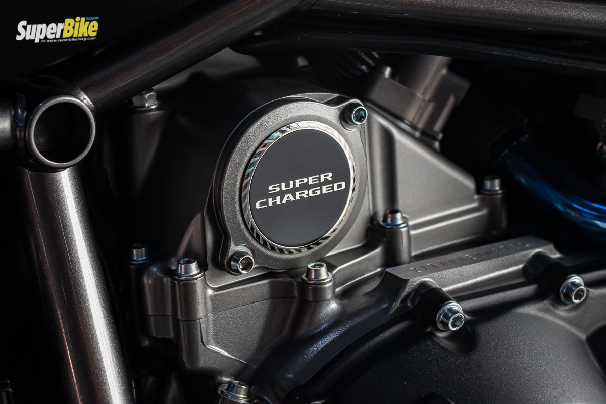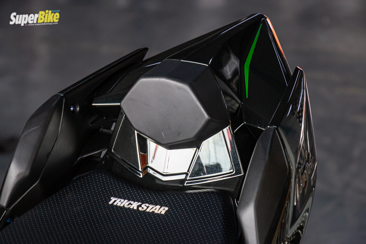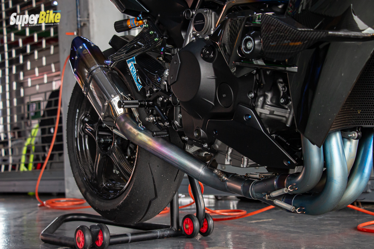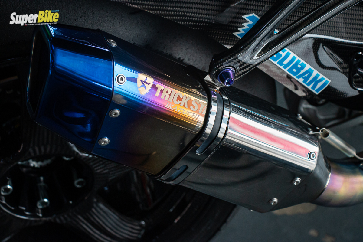 ในส่วนของท่อไอเสียเป็นของ Trick Star Titanium Full System ใส่เพื่อลดน้ำหนักให้เบาลงสวยด้วยในส่วนของสมรรถนะนั้นต้องบอกว่าอากาศออกมาดีกว่าเดิม ส่วนเรื่องของเสียงดุดันแน่นอนบวกกับเครื่องยนต์ที่เป็นแบบ Supercharger บอกเลยว่าสุด