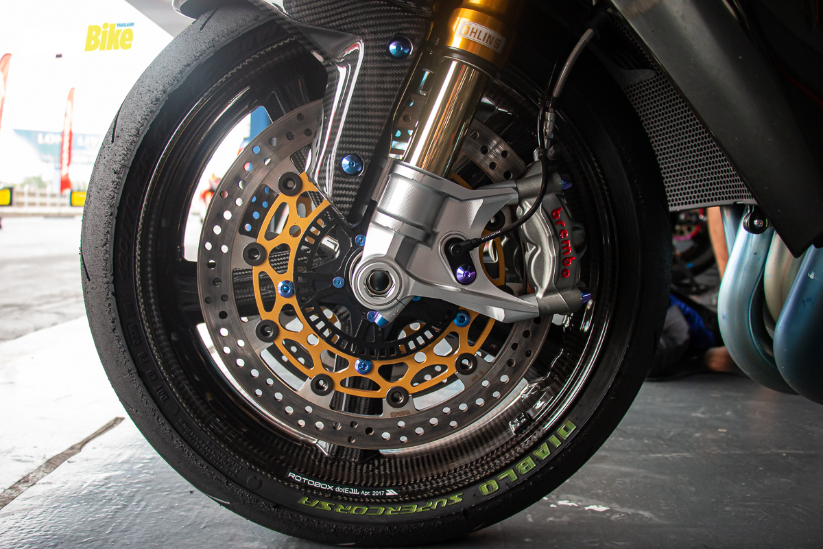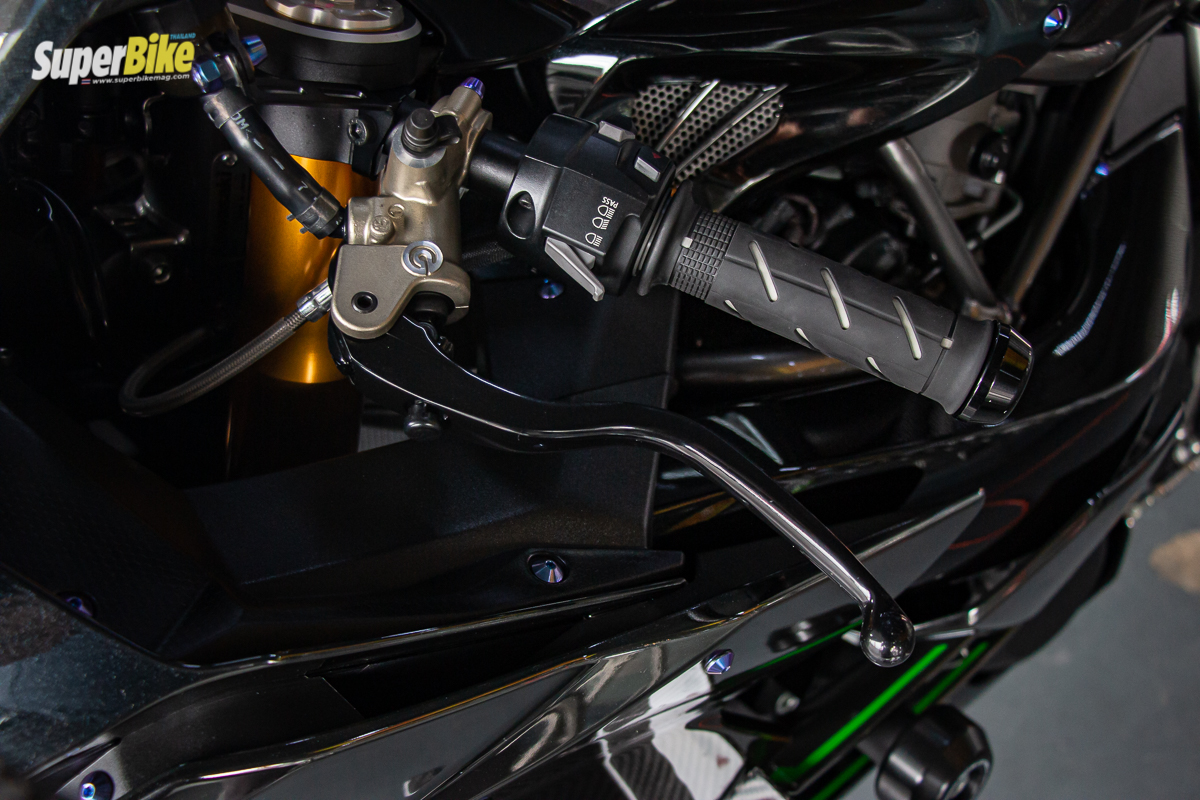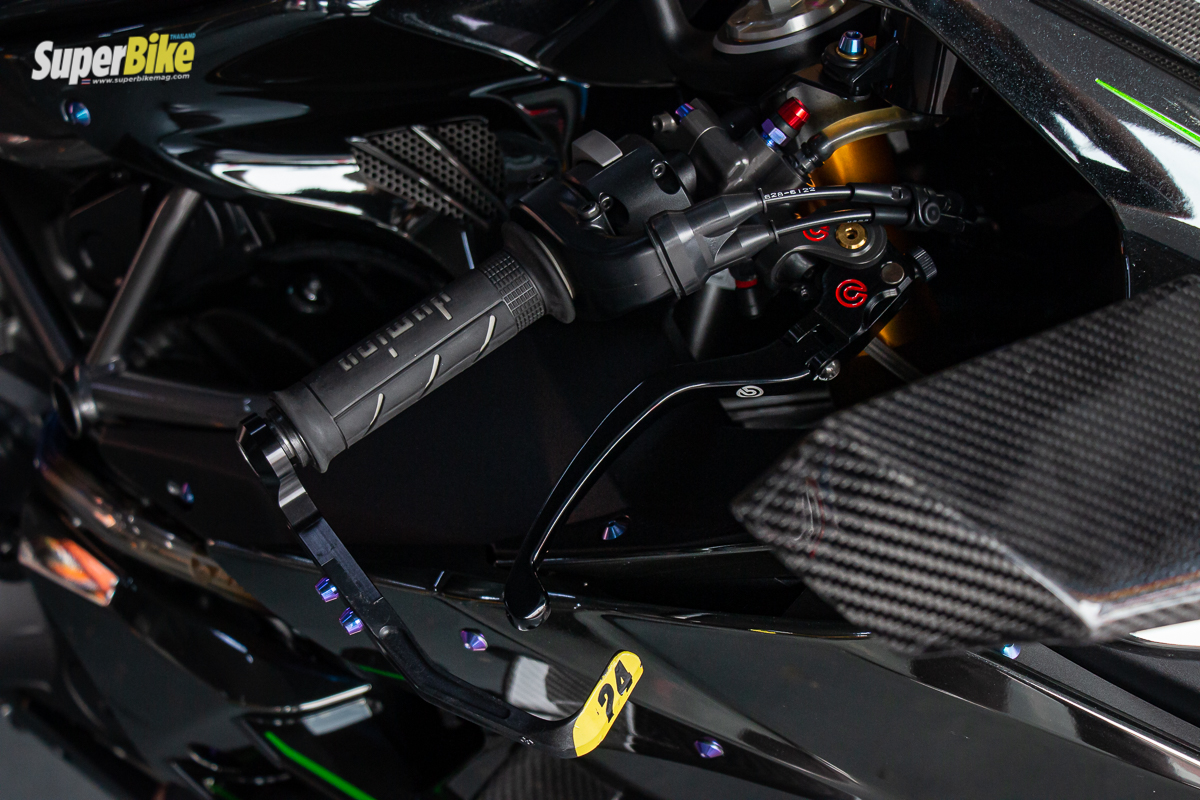 เริ่มจากชิ้นแรกกันก่อนเลยปั๊มเบรกบน Brembo GP Billet รุ่นที่ใช้ในรถแข่ง MotoGP ต่อด้วยการ์ดมือเบรกคาร์บอน Extreme Components ครบสูตรสวยงามตามท้องเรื่องแถมสมรรถนะไม่ลดหย่อนไปกว่าเดิมด้วยบอกเลยว่าแจ่มมาก
