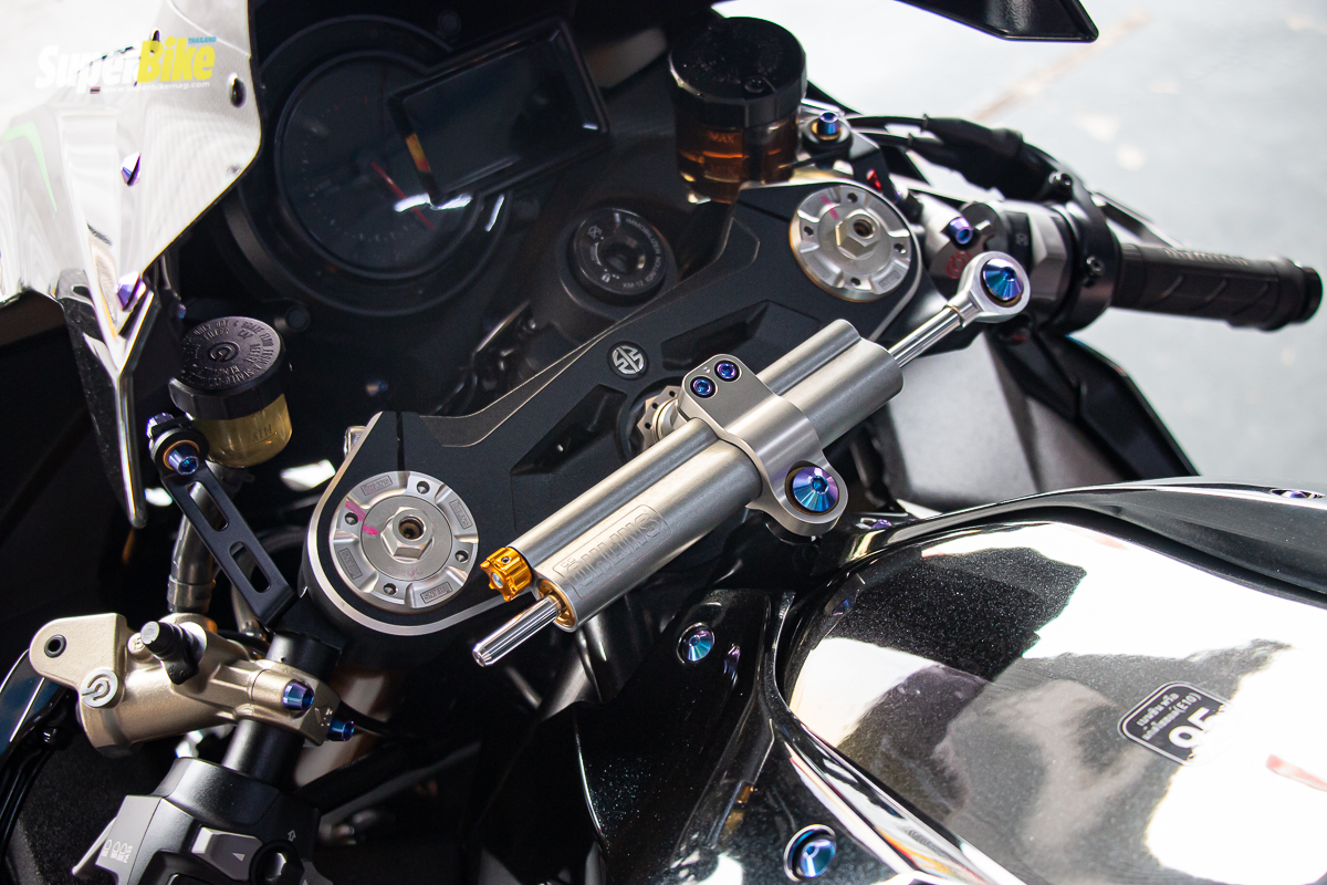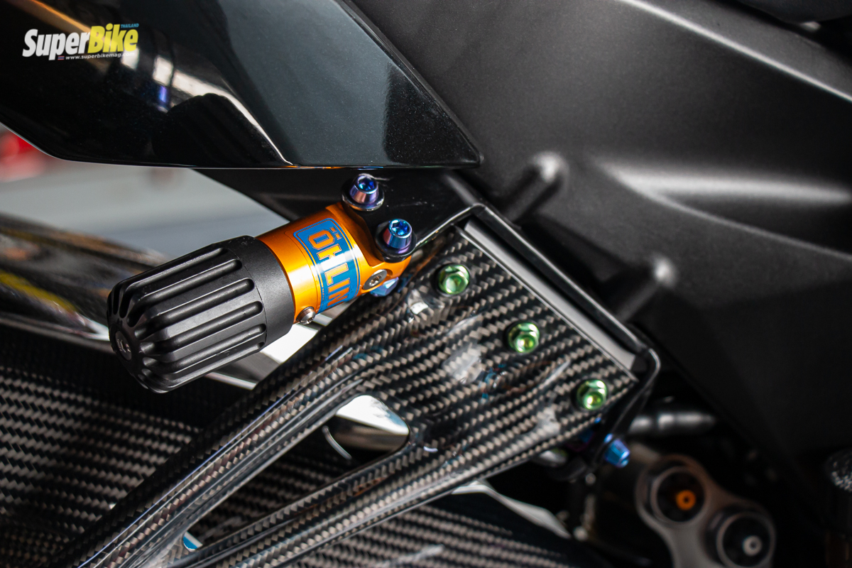 ต่อด้วยกันสะบัดจาก Ohlins ชิ้นนี้ที่เปลี่ยนเพราะว่ากันสะบัดของเดิมที่ให้มานั้นเป็นแบบกันสะบัดไฟฟ้า ไม่ค่อยตอบโจทย์กับการขับขี่แบบเรซซิ่งสักเท่าไหร่เลยเลือกเปลี่ยนมาใส่ตัวนี้แทนนั่นเองครับ