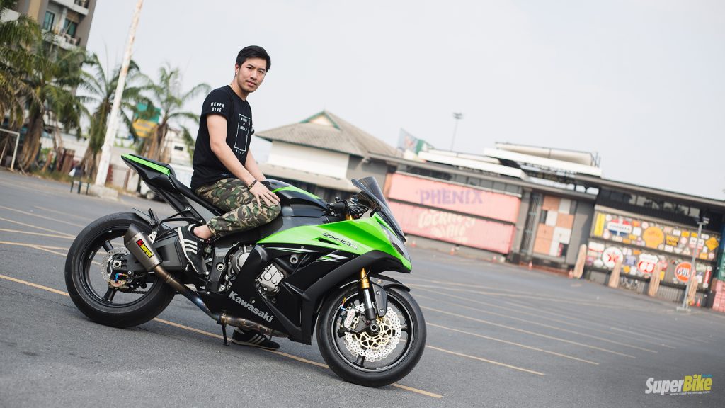สวัสดีครับชื่อต้นหรือเพื่อนๆ จะเรียกกันว่าต้นรักครับ ตอนนี้ทำงานอยู่เป็นพนักงานธนาคารแห่งหนึ่งสีเดียวกับรถ ZX-10 คันนี้ครับ นอกจากนี้ก็ขับขี่อยู่กับกลุ่ม TK Racing ตัวผมเริ่มต้นชอบรถมาตั้งแต่เด็กๆ แล้วครับ เอาง่ายๆ วัยรุ่นยุคผมเนี่ยต้องดูหนังมาก่อน เรื่องผู้หญิงข้าใครอย่าแตะ เห็นหลิวเต๋อหัว ขับรถบิ๊กไบค์ เราก็ชอบมาตั้งแต่ตอนนั้น ซึ่งสมัยก่อนเองก็จะมีแต่รถพวกประเภทอินวอย คันนึงราคาไม่กี่หมื่น พวก Superfour, XJR ก็ได้มีโอกาสไปขี่ของรุ่นพี่ ทีนี้ก็อยากจะได้บ้างละ ทีนี้พอยุคหลังๆ เนี่ยตำรวจบ้านเราเริ่มเข้มงวดเรื่องรถอินวอยมากขึ้น ก็เลยมองหารถที่จะขี่ได้สบายใจไม่ต้องกังวลเรื่องตำรวจ ก็มาเริ่มที่ Kawasaki Z250 ขี่ไปสักพักออกทริปบ่อยเข้าไปกับพวก 650, 1000 เริ่มรู้สึกว่าไม่พอมือละ ก็เลยเปลี่ยนเป็น Honda CBR 650 คันนี้ก็เริ่มทำให้เข้ามาขี่ในสนามบ่อยขึ้น ได้มาฝึกอยู่กับทางพี่ตึก TK Racing ซึ่งตอนนั้นเองก็ฝันไว้แล้วแหละ ว่าซักวันจะต้องอัพขึ้นมาเป็น ZX-10 ให้ได้ ด้วยความที่ชอบในรูปทรงที่ดูดุดันของมันด้วยแล้วก็เรื่องของสมรรถนะของมันอีกด้วย ก็ค่อยๆ เก็บเงิน จนทุกวันนี้ก็ได้เป็นเจ้าของสมใจครับ ส่วนไลฟ์สไตล์ในการขับขี่ของผมเองก็จะใช้รถในชีวิตประจำวันครับ หลังๆ มาก็จะใช้ขี่ไปทำงานบ่อยขึ้น เพราะว่าทำเวลาได้ ไม่ต้องออกไปเผชิญรถติด ได้นอนเต็มอิ่มมากขึ้นครับ นอกจากนั้นก็จะมีออกทริปกับกลุ่ม TK Racingที่เหลือนอกจากนั้นเวลาว่างก็จะมาเจอกันกับพี่ๆน้องๆในกลุ่มไปขี่เล่นตอนกลางคืนไหว้พระออกหาของกินอะไรประมาณนั้นครับ