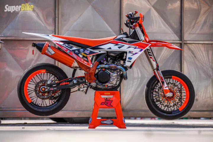 สำหรับ KTM 450 SMR แต่ง คันนี้เริ่มจากรูปลักษณ์ภายนอก กับตัวรถรูปทรงโมตาร์ด ที่มาพร้อมกับสีประจำค่ายพร้อมลวดลายประดับตกแต่งรอบคัน และ #13 หมายเลขคู่ใจที่พร้อมจะคว้าโพเดียมในสนามแข่งขัน ต่อกันที่ส่วนแผงคอแต่งบน-ล่าง ยึดด้วยน็อตไทเทเนียมสีม่วงสวยงาม นวมแฮนด์หน้ารถติดตั้งจากโรงงาน ฝั่งประกับฝั่งซ้าย จะพบกับปั๊มคลัตช์ Brembo กระปุกน้ำมันคลัตช์ Kite พร้อมครอบคาร์บอนจาก CMT ก้านคลัตช์ ARC แฮนด์ Ariete และการ์ดแฮนด์ RTech