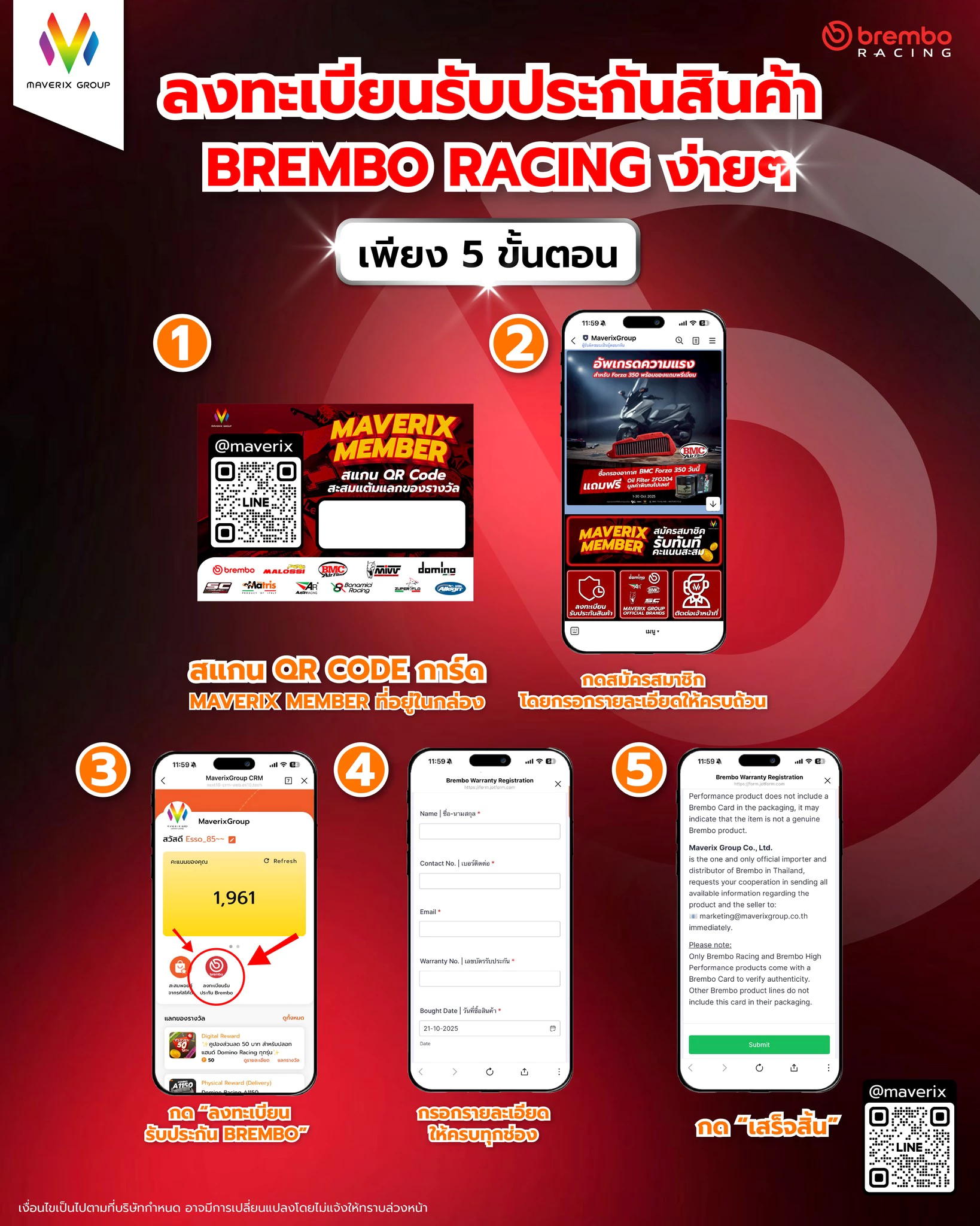 สำหรับใครที่อยากมีคาลิเปอร์ Brembo Racing คุณภาพใช้งานซักชุด อัปเกรดระบบเบรกหรือกำลังมองหาฟีลลิ่งประสบการณ์ใหม่บนรถของท่านไม่ว่าจะเป็นซุปเปอร์ไบค์ตัวพัน รถซุปเปอร์สปอร์ตไซส์กลาง รถออโตเมติกหรือแม้กระทั่งสายคลาสสิกเรโทร ครั้งนี้ตัวแทนนำเข้าในไทยอย่าง Maverix Group ก็จะมาอัปเดตข้อมูล การลงทะเบียนเพื่อรับสิทธิ์การรับประกันสินค้านาน 6 เดือน พร้อมคะแนนสะสมเพื่อแลกซื้อสินค้าในเครือเรียกได้ว่า ซื้อแล้ว ได้รับประกัน เก็บคะแนนสะสมและการันตีแท้ 100%