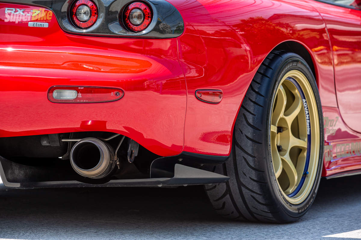 มาดูกันที่รูปลักษณ์ภายนอกกันก่อน สำหรับเจ้า RX7 คันนี้ถูกตกแต่งด้วยชุด Body kit by Vertex กระจกข้างเป็นของ Ganador ด้านหลังเป็น diffuser ของ Re Amemiya ชิ้นใหญ่ไว้สำหรับตัดอากาศกดตัวรถด้านท้ายทำงานพร้อมกับสปอยเลอร์คาร์บอนขนาดใหญ่ ที่จะช่วยตัดอากาศกดตัวรถให้นิ่งยิ่งขึ้น