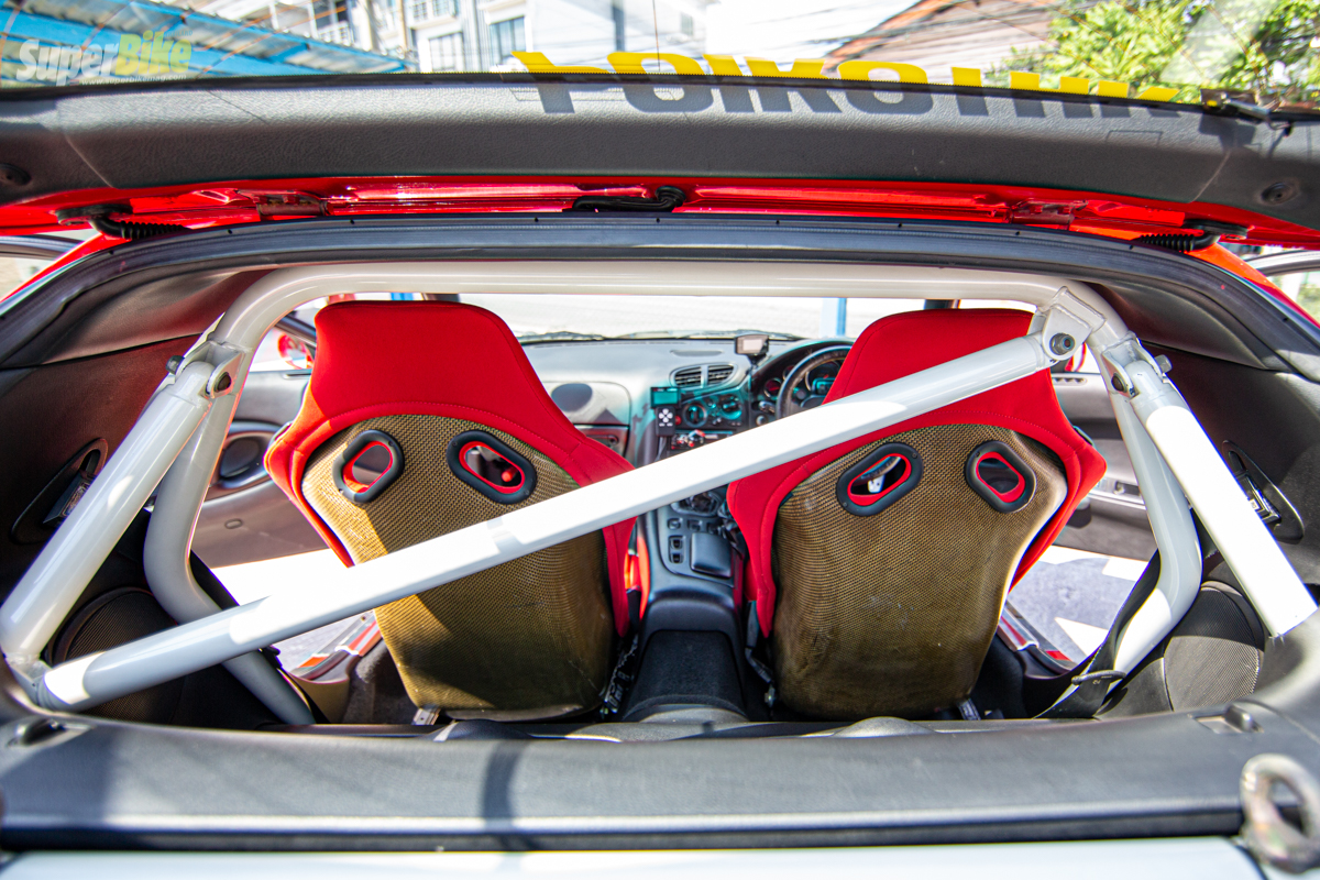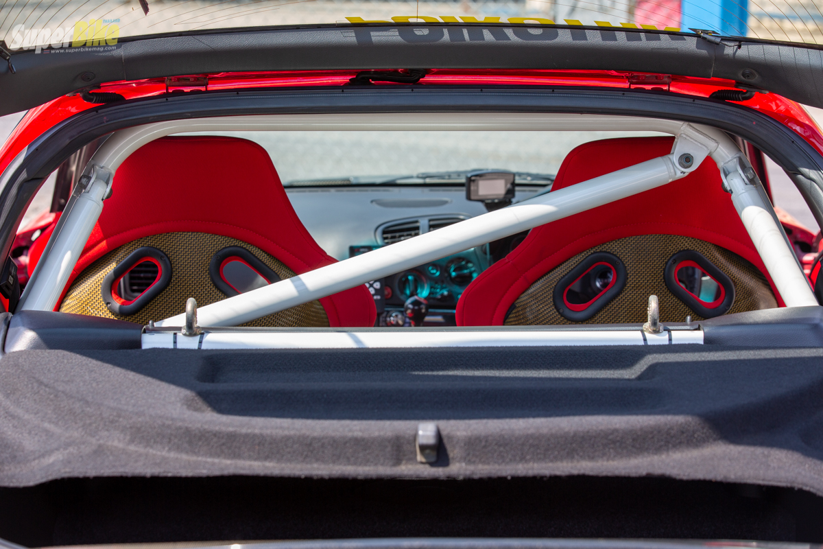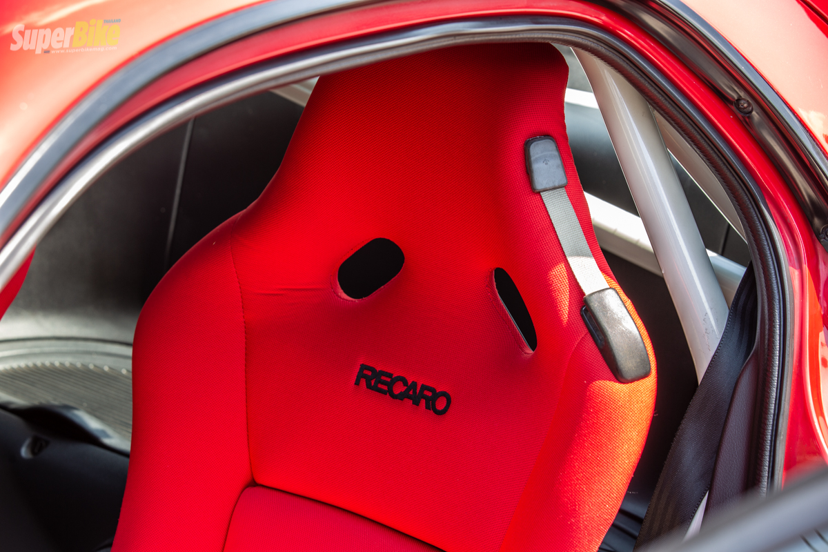 ภายในยังคงความซิ่งที่ขาดไม่ได้เลยนั้นคือเบาะแต่ง Recaro หลังแข็งปรับได้สามระดับ สวยงามนั่งกระชับมั่นใจปลอดภัยเพิ่มขึ้นไปอีกกับ โรบาร์ 4 จุดที่ออกแบบยึดไว้ด้านหลังขึ้นลงรถสะดวกอีกด้วย
