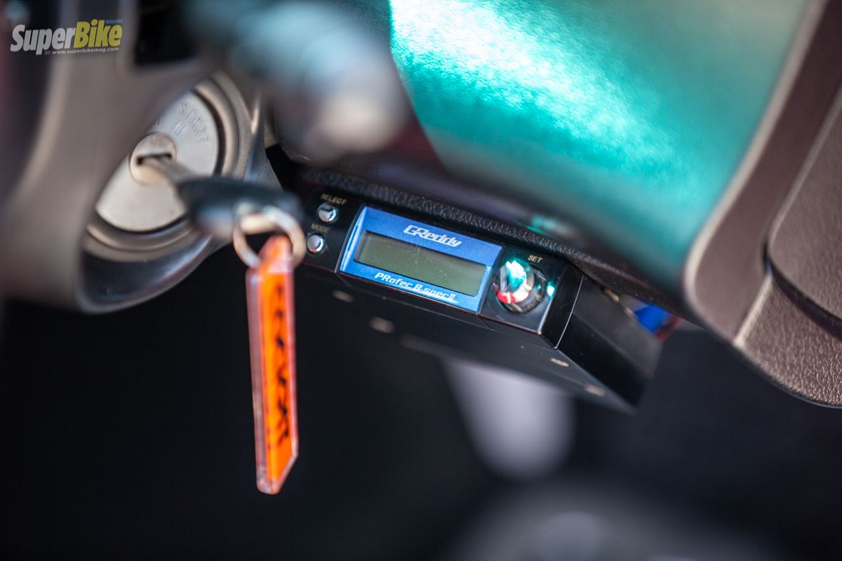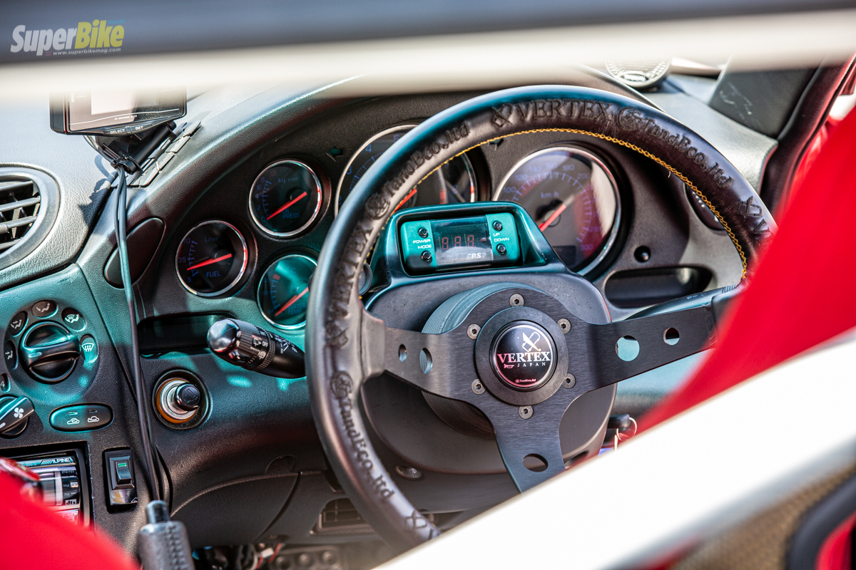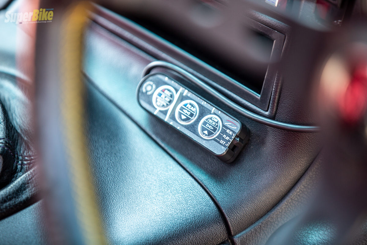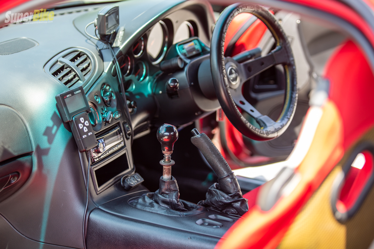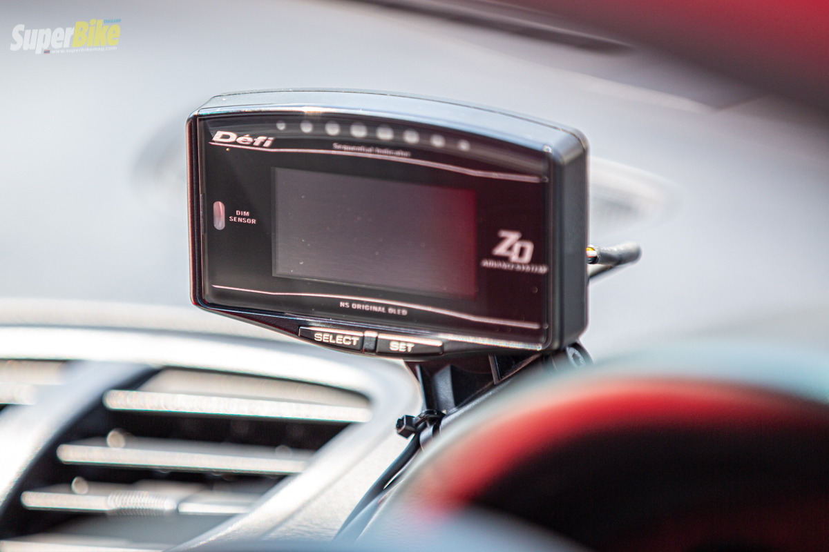 มาดูกันต่อที่ภายในห้องโดยสารถูกใส่อุปกรณ์แบบเรียบง่ายจำเป็นสำหรับการใช้งานเรามาเริ่มกันที่พวงมาลัยถูกใส่เป็นของ Vertex มีการติดตั้งตัวปรับบูสไฟฟ้าเป็นของ Projec B Spec 2 เกจ Defi ZD ตัวเดียวอยู่หมัด เพิ่มตัววัด Boost EBS อีก 1 ตัวกลางคอนโทรลพวงมาลัย