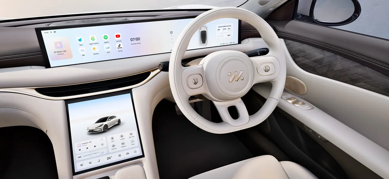 ตัวรถมีความยาว 4,931 มม. มอบพื้นที่ห้องโดยสารที่กว้างขวาง ตกแต่งด้วยวัสดุ Soft-touch ทั่วทั้งคัน หลังคากระจก Panoramic Glass Roof และระบบหน้าจอคู่ที่ประกอบด้วยหน้าจอหลัก 10.5 นิ้ว และหน้าจอความบันเทิงขนาดใหญ่ 26.3 นิ้ว มอบประสบการณ์การเดินทางที่หรูหราและทันสมัย