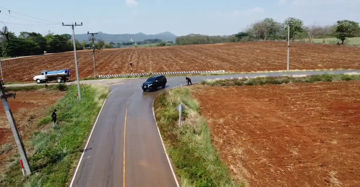 โจทย์ความโหดของด่านนี้อยู่ตรงที่ ถนนเส้นที่เราใช้ทดสอบไม่ใช่แทร็กทดสอบมาตรฐานที่พื้นผิวเรียบเนียน แต่เป็นถนนชนบทที่ห้อมล้อมไปด้วยทุ่งนาและพื้นที่การเกษตร มีรถแทรกเตอร์วิ่งผ่านไปมาจนทิ้งคราบดินโคลนและฝุ่นฝังแน่นไว้เป็นระยะๆ พูดให้เห็นภาพคือ ขนาดทีมงานใส่รองเท้าผ้าใบเดินลงไปถ่ายรูปยังรู้สึกลื่นล้มได้ง่ายๆ