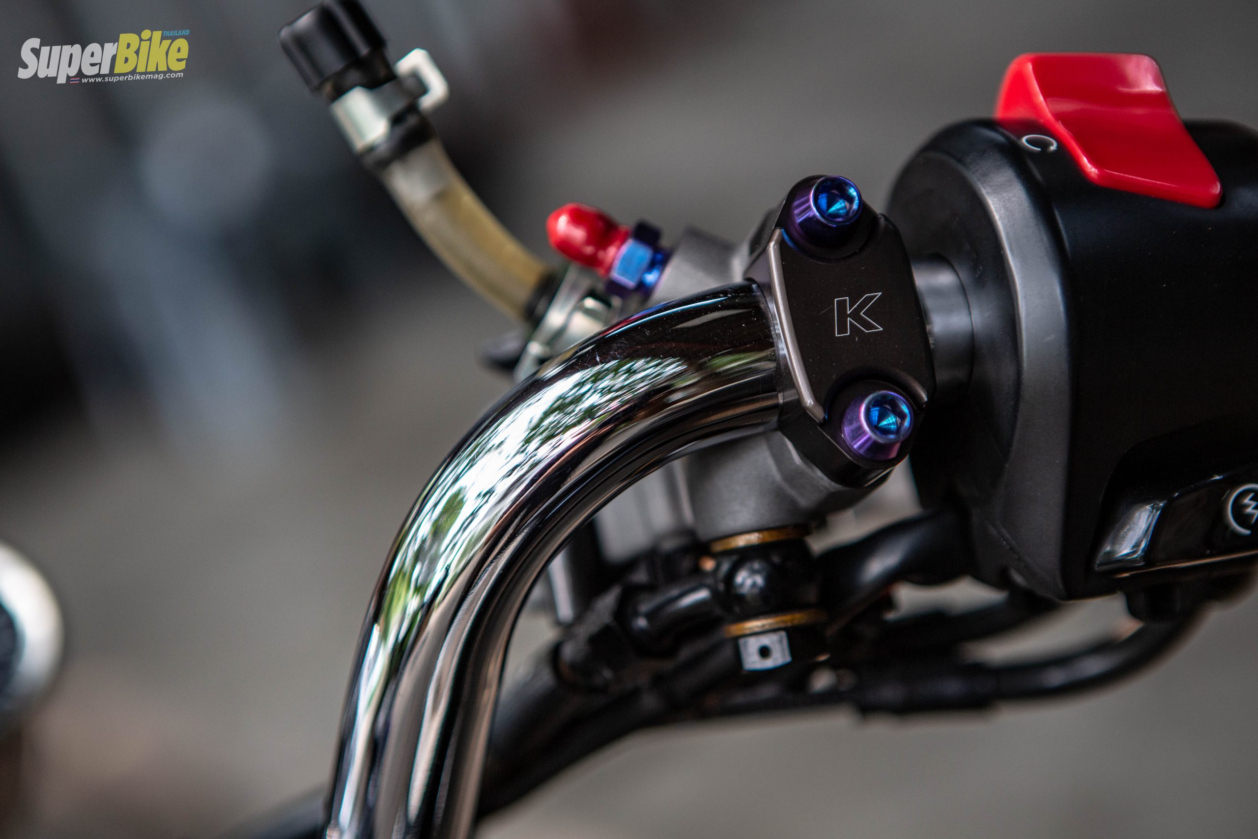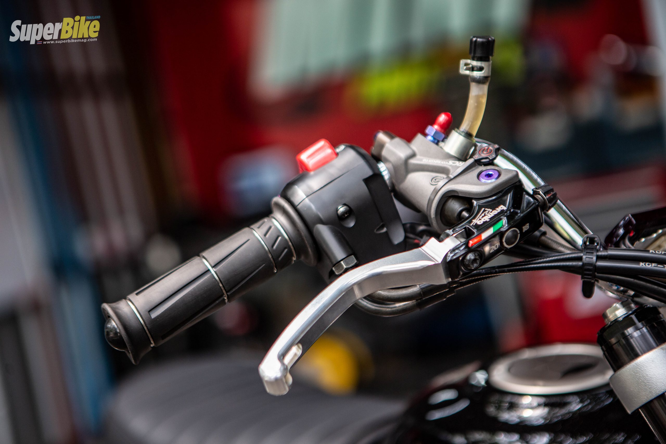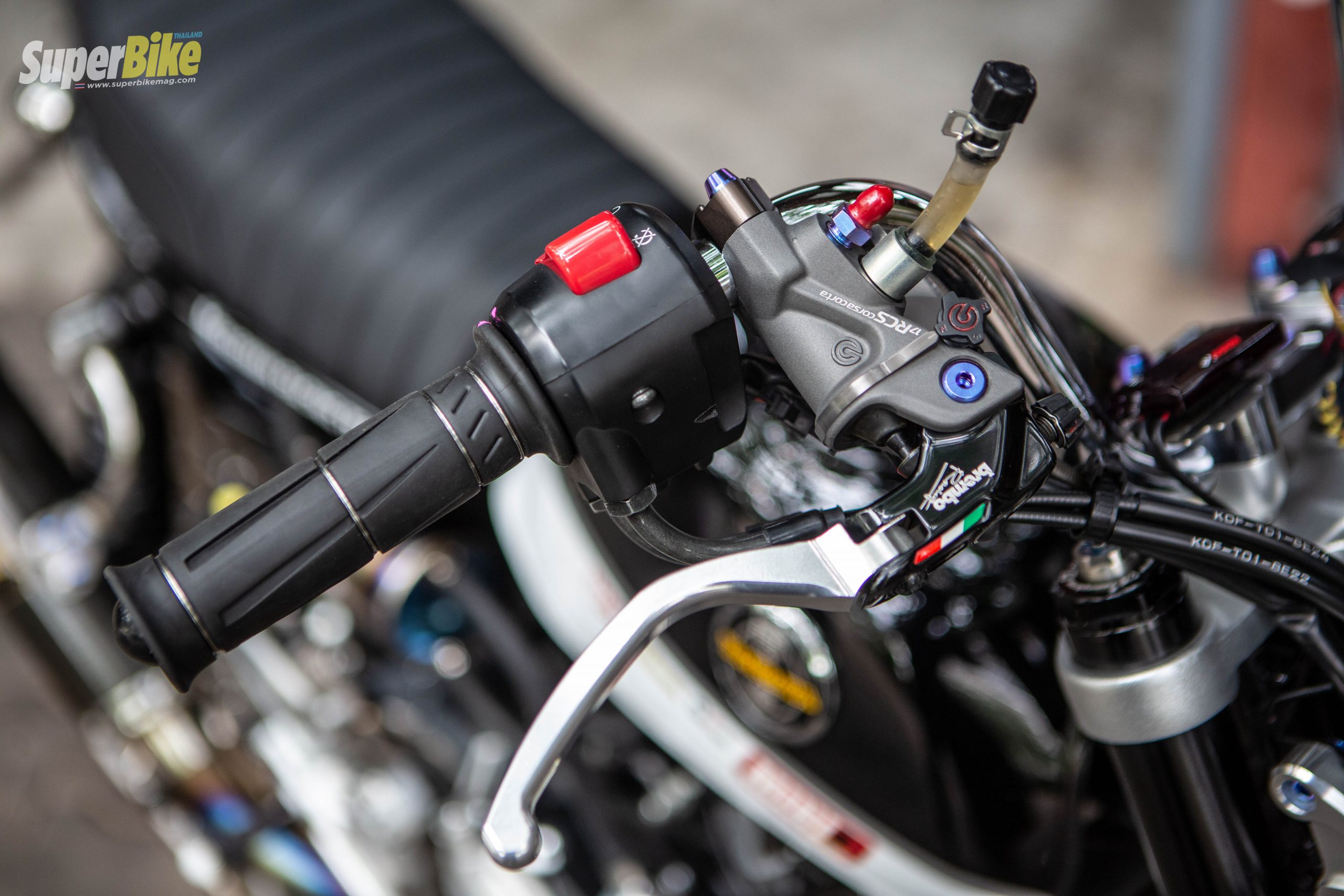 แฮนด์ฝั่งขวา ถูกใส่ปั๊มกระทั้งบนเป็นของ Brembo ตัวล่าสุดพร้อมกับเปลี่ยนก้านเป็นของ Koken สวยงาม มาต่อกันที่ฝั่งซ้าย ที่เป็นมือคลัตช์ก็ถูกเปลี่ยนเป็นของ Takegawa