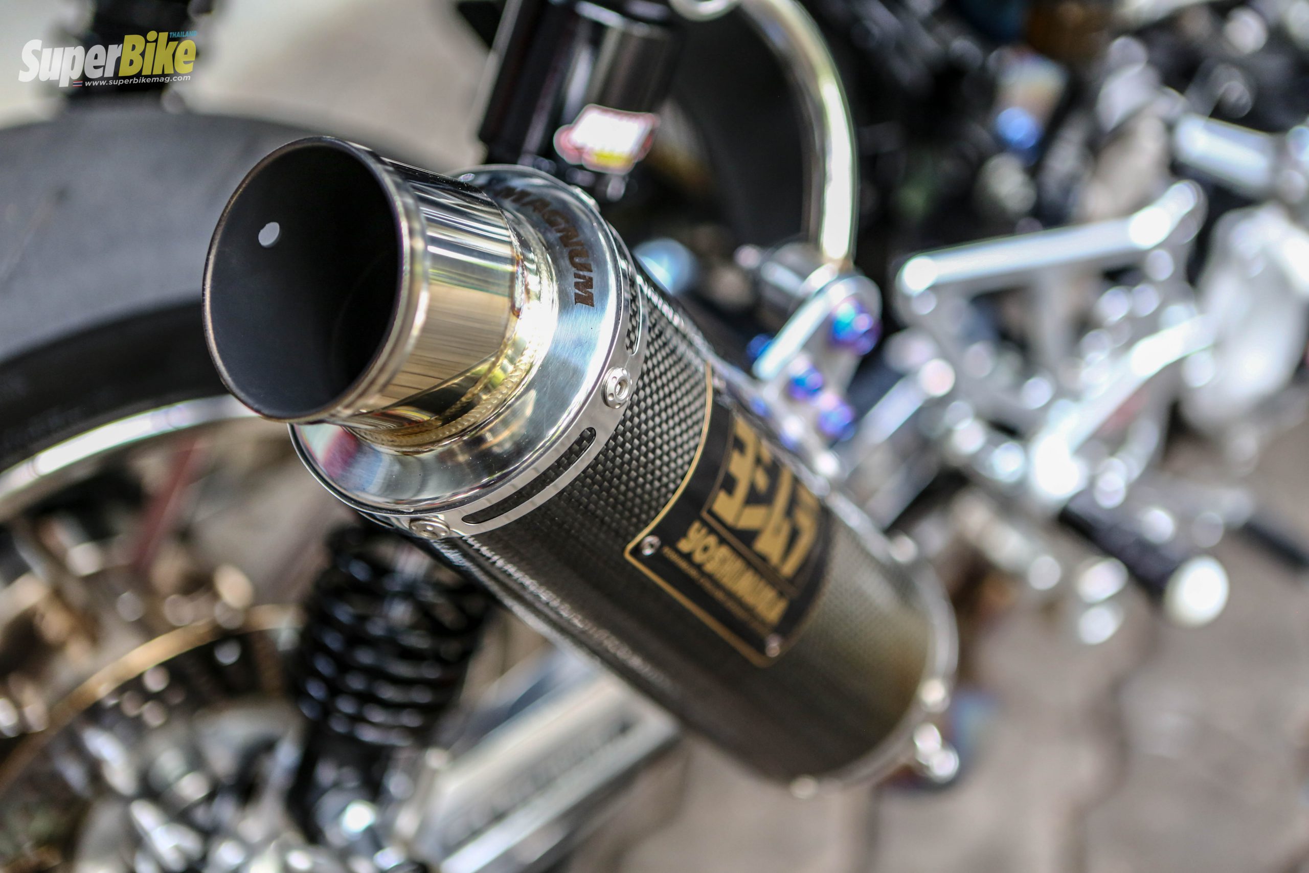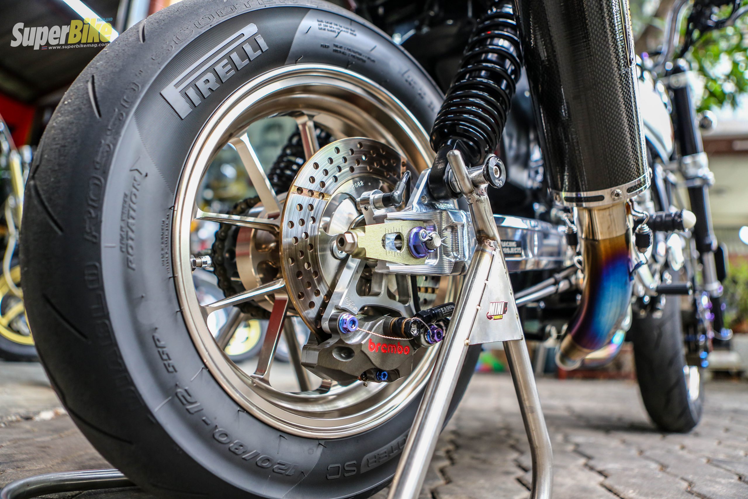 ต่อกันที่ด้านหลังเด่นด้วยท่อไอเสียแบบฟูลไทเทเนียม ของ Yoshimura ได้ฟังเสียงแล้วขอบอกเลยว่า ลั่นจับใจเลยละครับ โช้คหลังเจ้าตัวยังไม่ขอบอกแบรนด์ เพราะยังเป็นตัว prototype อยู่ เบรคหลังเป็น Brembo จานเบรคเป็นของ Sun Star ความแรงและการคอนโทรลต่างๆ ถูกส่งมาที่ยาง Pirelli Rosso Scooter SC ที่เป็นยางคอมปาวพิเศษ จากทางพิเรลลี่ หนึบแน่นอน
