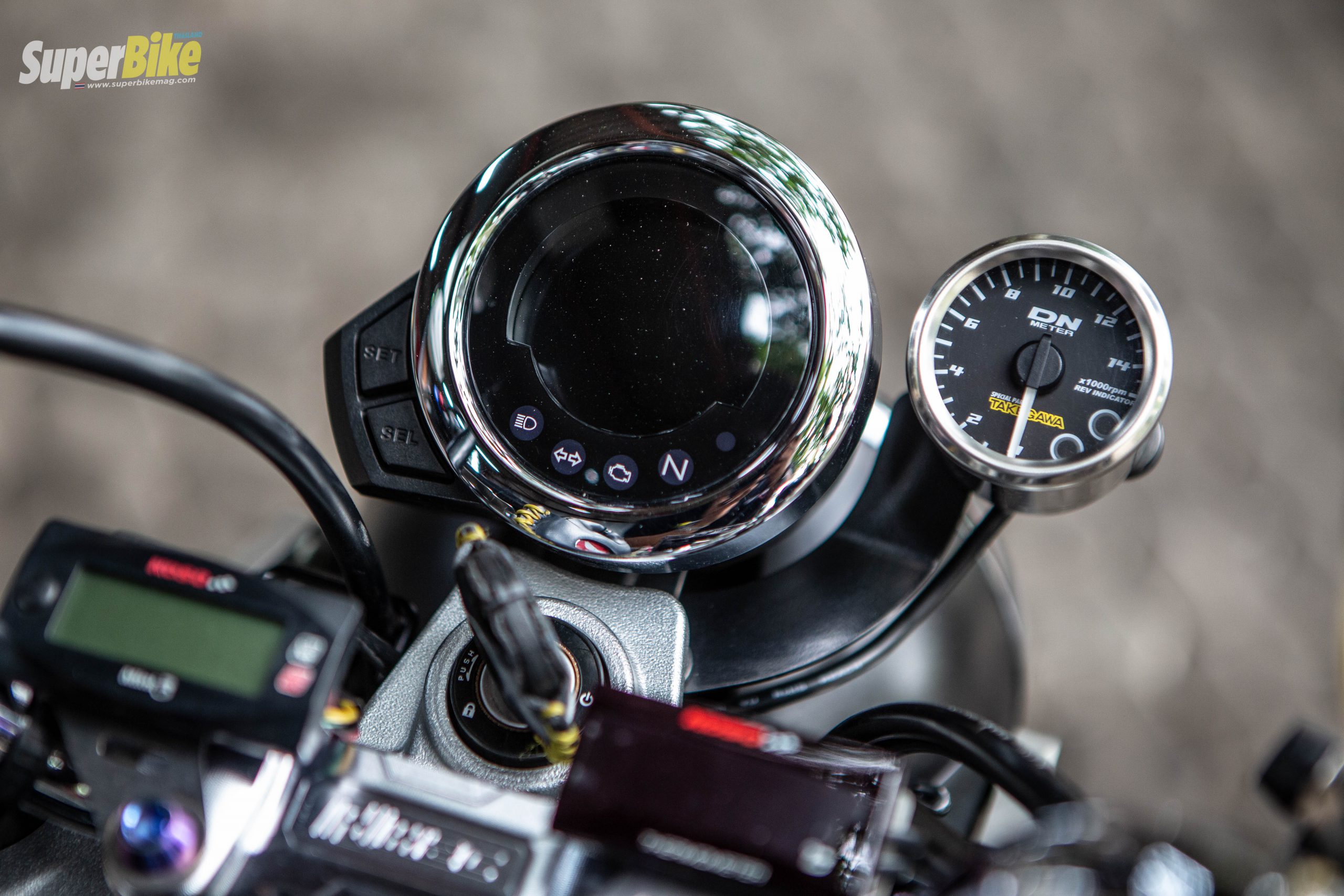 ตัวเรือนไมล์ยังเป็นของเดิมติดรถได้มีเพิ่มไมล์วัดรอบเครื่องยนต์ Takegawa เพิ่มขึ้นมาเพื่อที่จะใช้บอกรอบเครื่องยนต์และเปลี่ยนเกียร์ที่รอบเครื่องดีที่สุด บนแฮนด์บาร์มีการติดวัดโวล์ตกำลังไฟฟ้าเพิ่มอีกด้วย