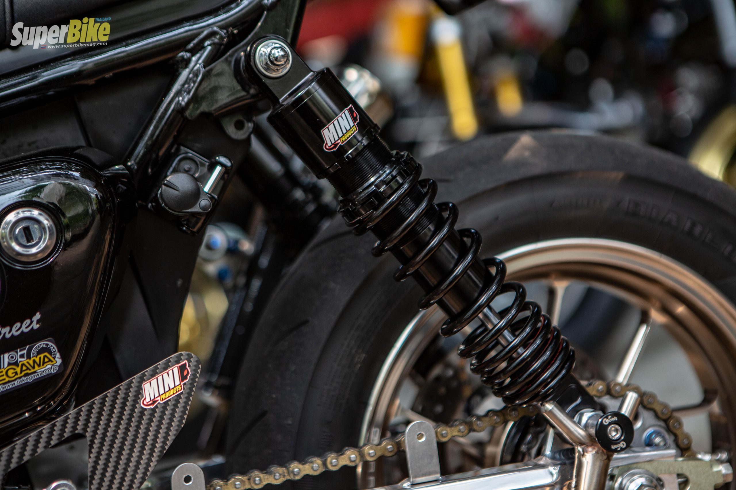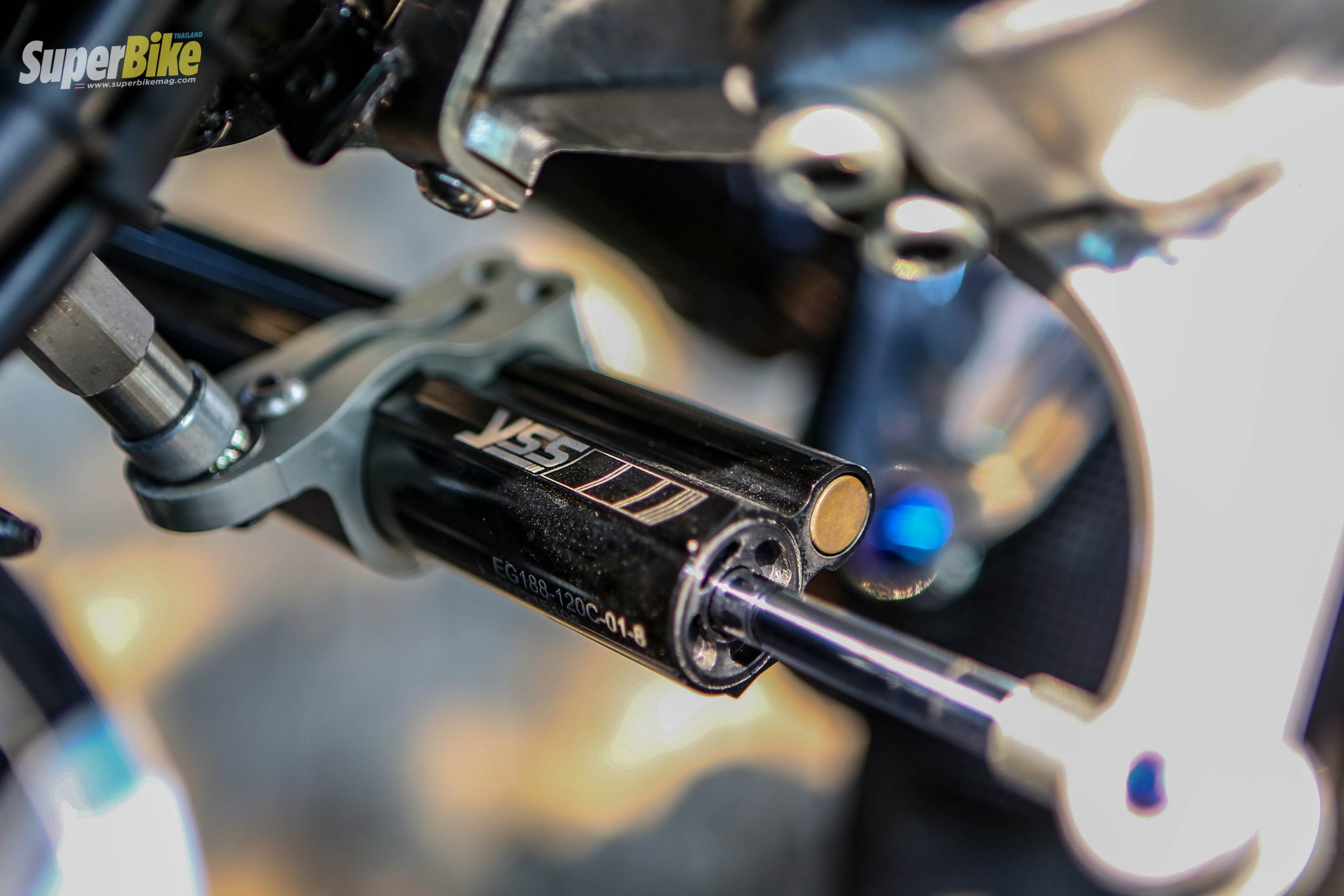 เกียร์โยงเป็นของ kitaco ถูกปรับให้เหมาะสมกับกับคนขับ ที่เห็นสวิงอาร์มเงาๆนั้นเป็นของ Over Racing ดูดีมีสไตล์เป็นของตัวเอง ผสมผสานของแต่งได้อย่างลงตัว