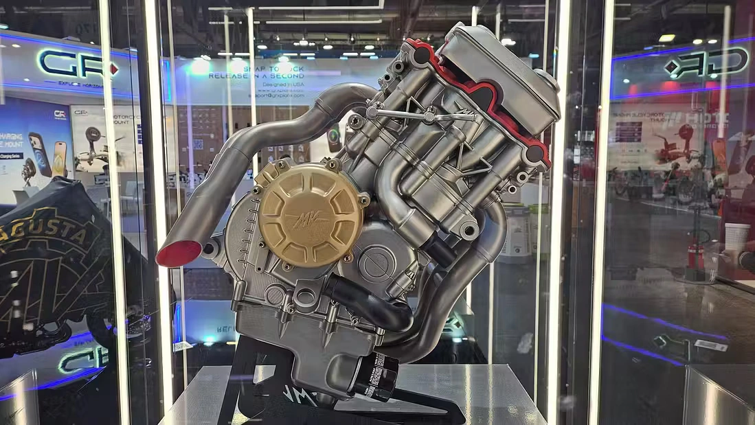 ซึ่งการจัดวางให้อารมณ์คล้ายกับเครื่องยนต์ตระกูล VR จากค่าย Volkswagen ที่เป็นเครื่องหลายสูบวางชิดกัน ใช้ข้อเหวี่ยงร่วมกันชุดเดียว แต่ MV Agusta หยิบไอเดียมาเรียบเรียงใหม่ให้เหมาะกับมอเตอร์ไซค์ ทั้งในแง่มิติ ความกะทัดรัด และน้ำหนัก และอีกหนึ่งจุดที่ถูกพูดถึงคือการแยกทางเดินไอเสียอย่างชัดเจนเป็น สามท่อด้านหน้า และสองท่อด้านหลัง ซึ่งการแยกพอร์ตและเฮดเดอร์แบบนี้ช่วยให้การระบายความร้อนทำได้ดีขึ้น ลดโอกาสเกิด “จุดอับความร้อน” แบบที่เคยเป็นปัญหาในเครื่อง VR บางตระกูล