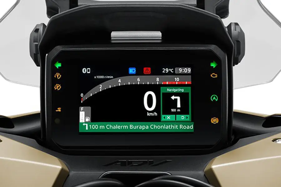 สิ่งที่ทำให้ NEW ADV160 2026 โดดเด่นกว่ารถรุ่นอื่นๆ ในระดับเดียวกันคือการเปลี่ยนจากเรือนไมล์ดิจิทัลแบบเดิม มาเป็น หน้าจอสี TFT ขนาด 5 นิ้ว (Full Color TFT Display) ที่มีความละเอียดสูง ให้ความคมชัดแม้ขับขี่กลางแสงแดดจ้า และมีรูปแบบการแสดงผลที่ทันสมัย