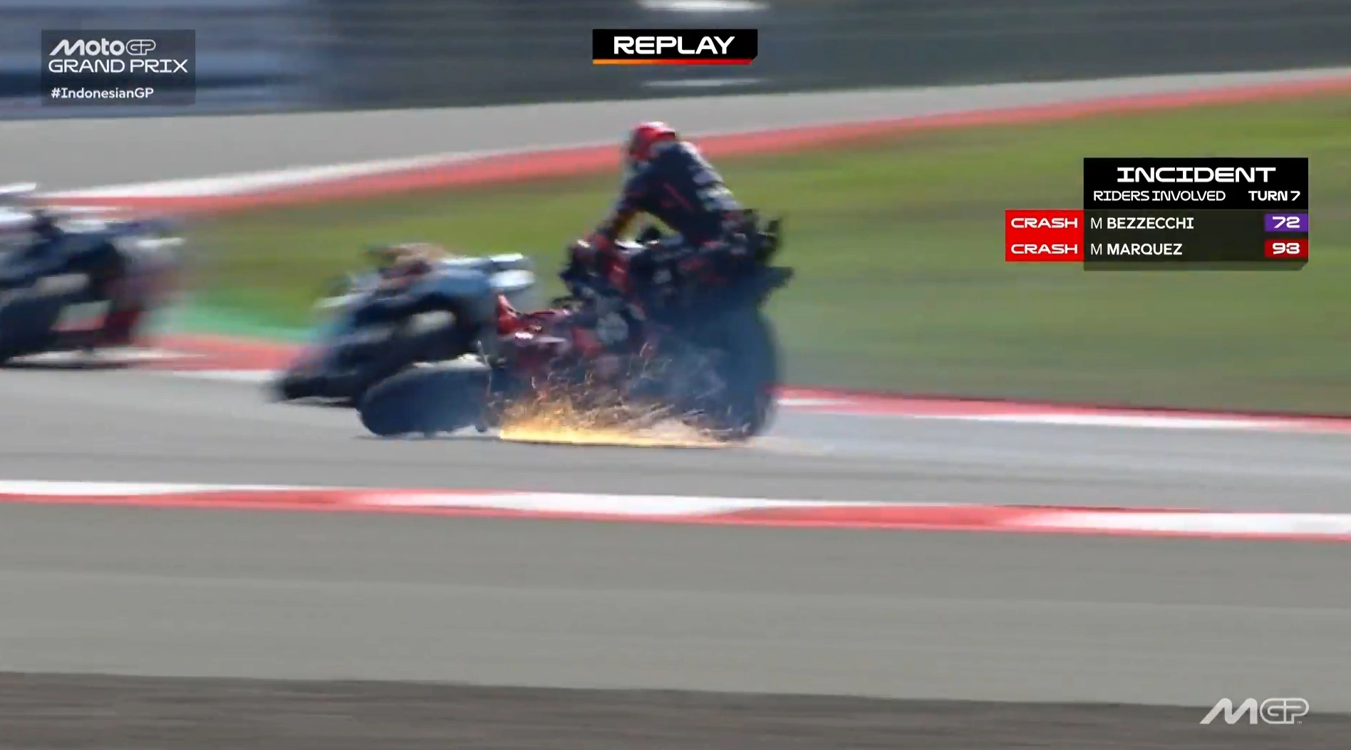 โดยในเหตุการณ์อุบัติเหตุดังกล่าวเกิดขึ้นในรอบเมนเรซที่สนามมันดาลิก้า ประเทศอินโดนีเซีย โดยพึ่งเริ่มการแข่งขันได้ไม่นาน ก่อนที่มาร์โก เบซเซคคี่จะพลาดท่าไปชนเข้ากับท้ายรถของมาร์ก มาร์เกซในโค้งที่ 8 ซึ่งแชมป์โลกเจ้าของหมายเลข 93 ได้รับบาดเจ็บกระดูกโคราคอยด์แตก และเอ็นที่ไหล่ขวา ซึ่งการผ่าตัดอาการที่กรุงมาดริดก็ผ่านไปได้ด้วยดี ตอนนี้อยู่ในช่วงระหว่างพักฟื้นเท่านั้น โดยถ้อยคำแถลงของคณะผู้ตัดสิน FIM ได้ระบุโทษของเบซเซคคี่ ดังนี้
