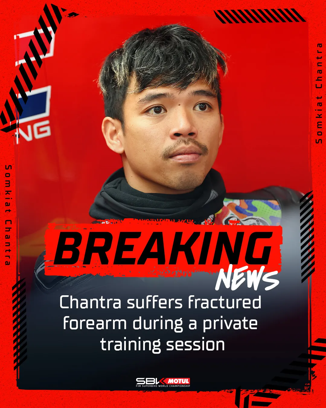 นับเป็นข่าวร้ายรับต้นปีสำหรับแฟนความเร็วชาวไทย เมื่อมีการยืนยันอย่างเป็นทางการว่า “ก้อง” สมเกียรติ จันทรา นักบิดชาวไทยคนแรกในประวัติศาสตร์ที่ขยับขึ้นไปลุยศึกชิงแชมป์โลกรายการ World Superbike Championship (WorldSBK) ฤดูกาล 2026 ได้รับบาดเจ็บรุนแรงระหว่างการฝึกซ้อมเตรียมความพร้อมก่อนเปิดฤดูกาล