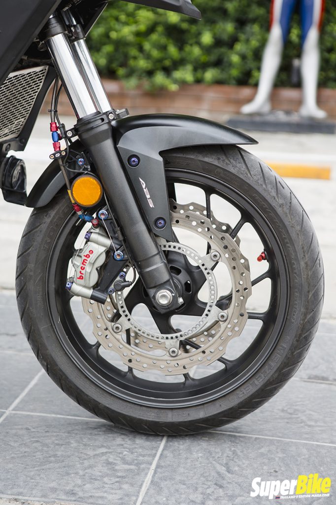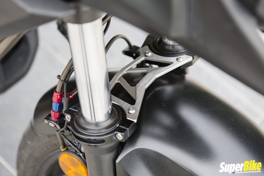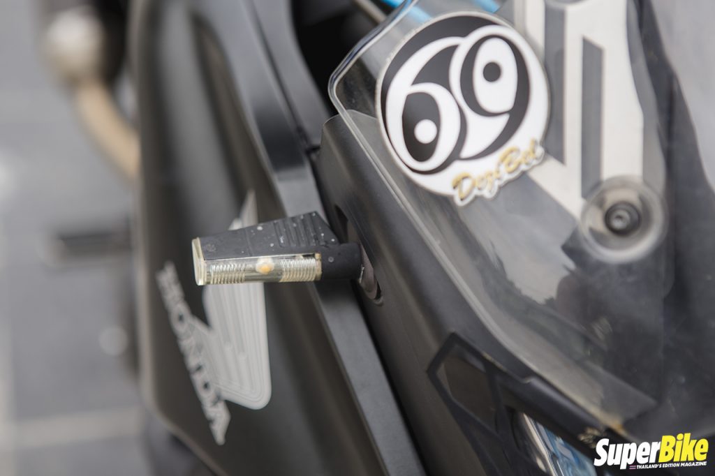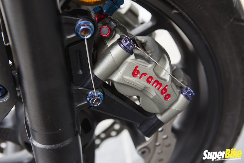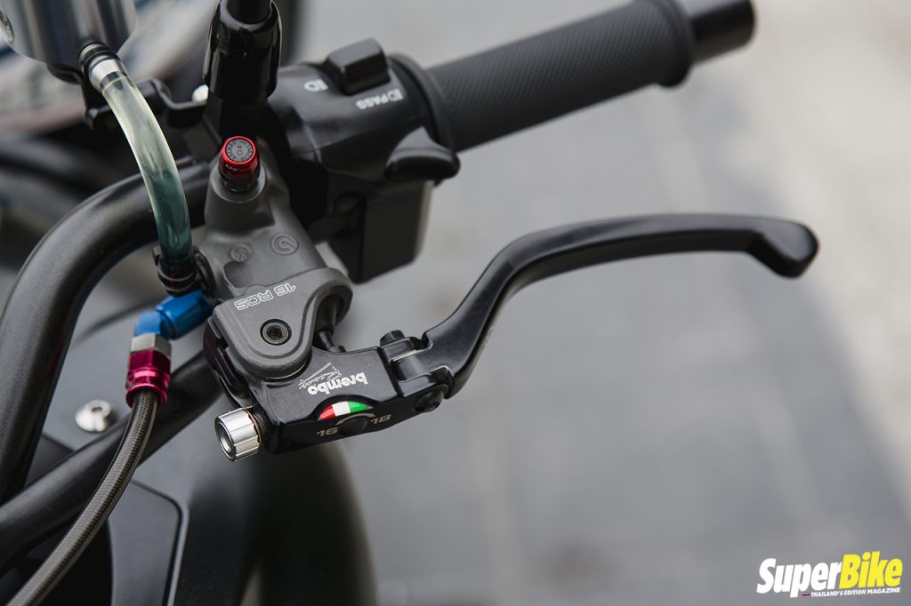 สำหรับแนวทางการแต่งของผม ก็จะเป็นการแต่งรถให้เข้ากับผู้ใช้ครับ โดยรถคันนี้ก็จะใช้งานทุกวัน เป็นส่วนหนึ่งของชีวิตเลยครับ ออกทริปด้วย ไปทุกที่ อยู่ด้วยกันตั้งแต่ตื่นจนเข้านอน คันนี้ชื่อเฉาก๊วย เพราะว่าสีดำทั้งคันครับ คุมโทนให้ดูเรียบๆ จะมองเรื่องเซฟตี้เป็นหลัก อย่างระบบเบรคก็ใช้ของ Brembo มีเปลี่ยนระบบคลัทช์เป็นคลัทช์น้ำมันให้นิ่มนวลขึ้น เวลารถติดก็จะสบายขึ้นครับ นอกจากนั้นก็มีเปลี่ยนล้อ เอาล้อจาก CB650 มาใส่ เพราะว่าอยากได้ระบบเบรคจากเดิมที่เป็นดิสก์เดี่ยวเปลี่ยนเป็นดิสก์คู่ เพื่อสมรรถนะในการเบรคที่ดีขึ้น แล้วก็จะได้เรื่องของลุค ได้ความบึกบึนของช่วงล่างเพิ่มขึ้นมาด้วยครับ มีแร็คหลังไว้มัดของตอบโจทย์เวลาออกท่องเที่ยว