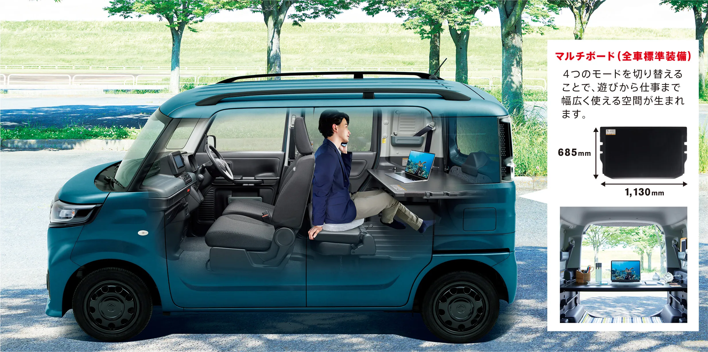 Suzuki Spacia Base 2026 จุดเด่นที่ทำให้ Spacia Base โดดเด่นกว่ารถรุ่นอื่นคือแผ่น “Multi Board” ที่แถมมาให้เป็นมาตรฐาน ซึ่งสามารถปรับตำแหน่งได้ 4 รูปแบบ ดังนี้: