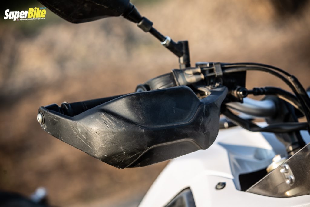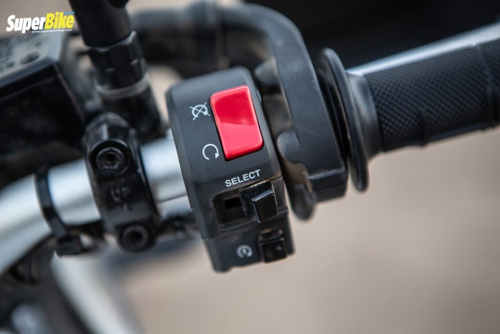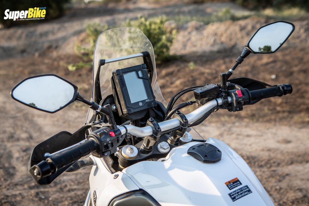 เจ้า T7 คันนี้โดดเด่นที่ไฟหน้าเท่ ดุดันสไตล์แรลลี่ เป็นไฟ LED ขนาดใหญ่ 4 ดวง ให้ความสว่างเหลือเฟือ (ไฟท้ายเองก็เป็น LED ด้วยเช่นกัน) เข้าคู่กับชิลด์บังลมหน้าใสขนาดสูงใหญ่กำลังดี ไม่บดบังเส้นทาง ไม่รำคาญสายตา (ผมสูง 172 ซม.) ถัดเข้ามาเป็นเรือนไมล์ดิจิทัลทรงสูงให้อารมณ์แรลลี่ดาการ์ พร้อมกับปุ่มเปิดปิดระบบ ABS ไว้ใช้งานเวลาปรับเปลี่ยนจากซิ่งมาลุย หรือจากลุยกลับไปซิ่ง ส่วนแฮนด์บาร์มาพร้อมกับการ์ดแฮนด์ขนาดใหญ่ป้องกันมือ ก้านคลัทช์ ก้านเบรก จากอุปสรรคต่างๆ หรือหินกระเด็น หรือป้องกันมือเวลาล้ม