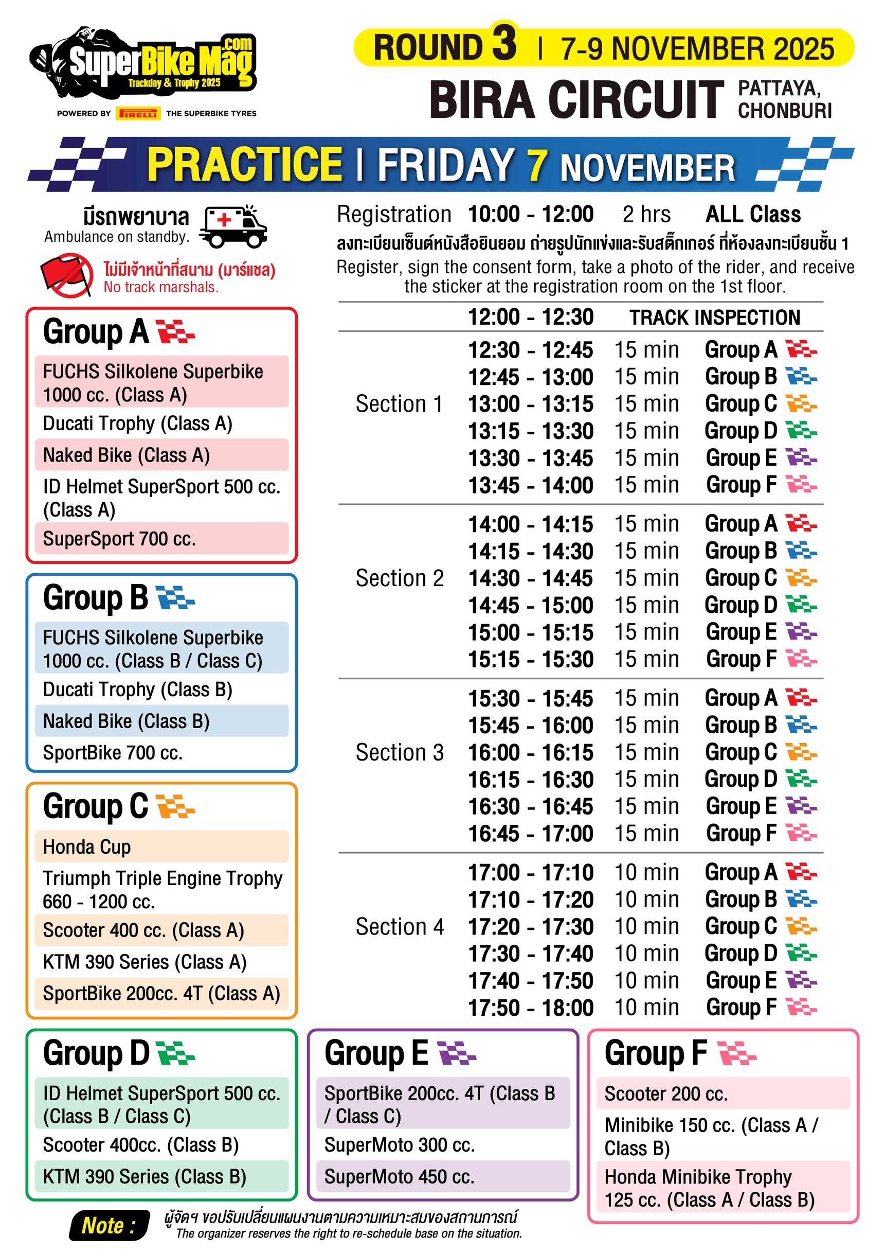 | 13.00 – 13.15 | C | Honda Cup / Triumph Twin Engine Trophy 900-1200cc / Scooter 400cc (A) / KTM 390Series (A) / SportBike 200cc. 4T (A) | Session 1 |