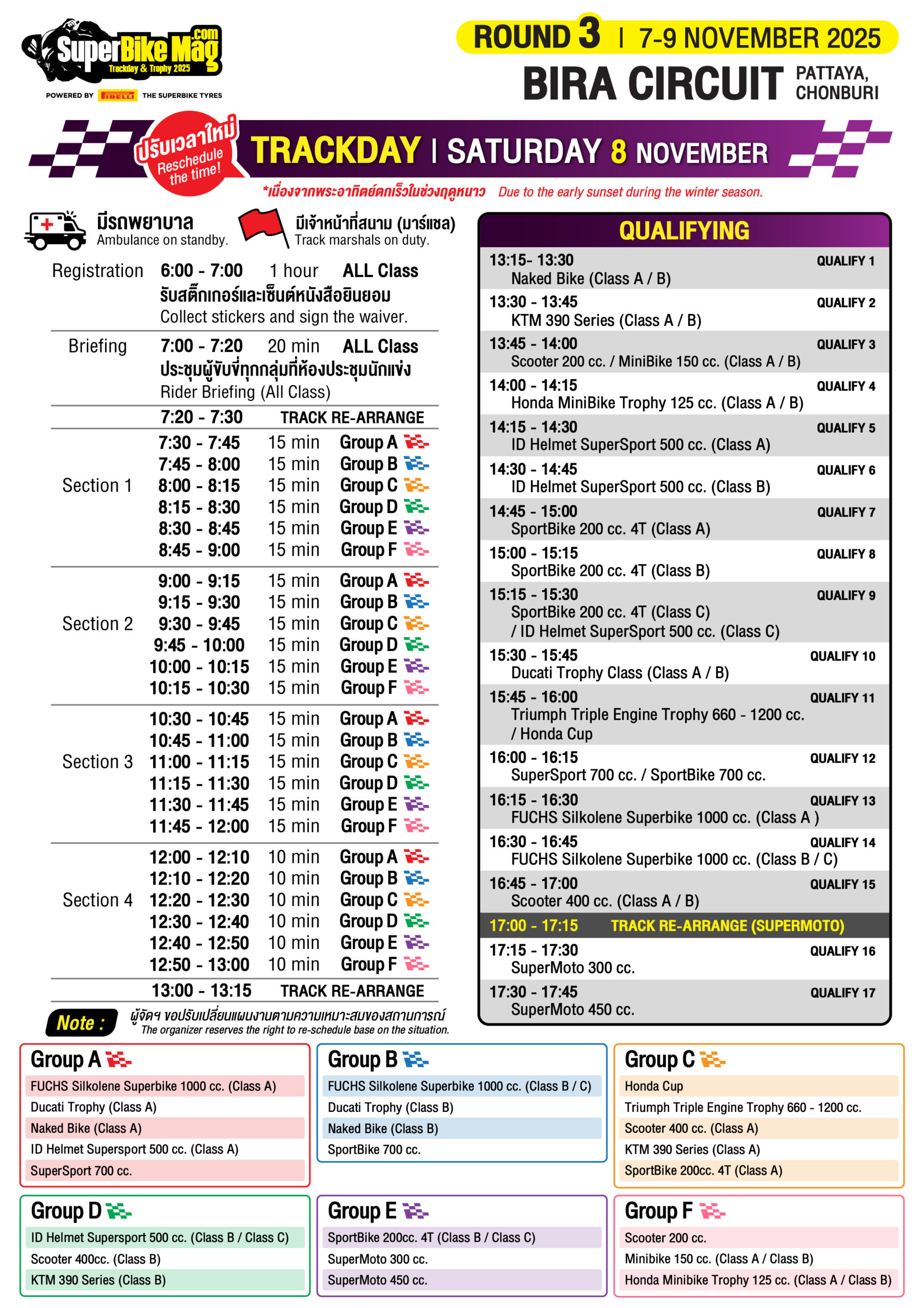 07.30 – 07.50 ประชุมผู้ขับขี่ทุกกลุ่มที่ห้องประชุมนักแข่ง