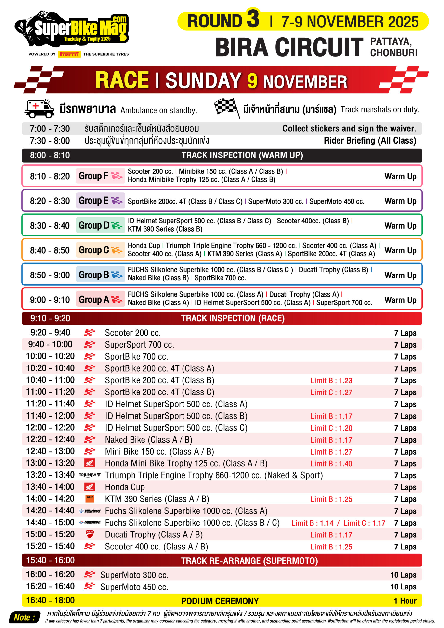 | 12.20 – 12.40 | Naked Bike Class A/B (15) | 7 Laps |