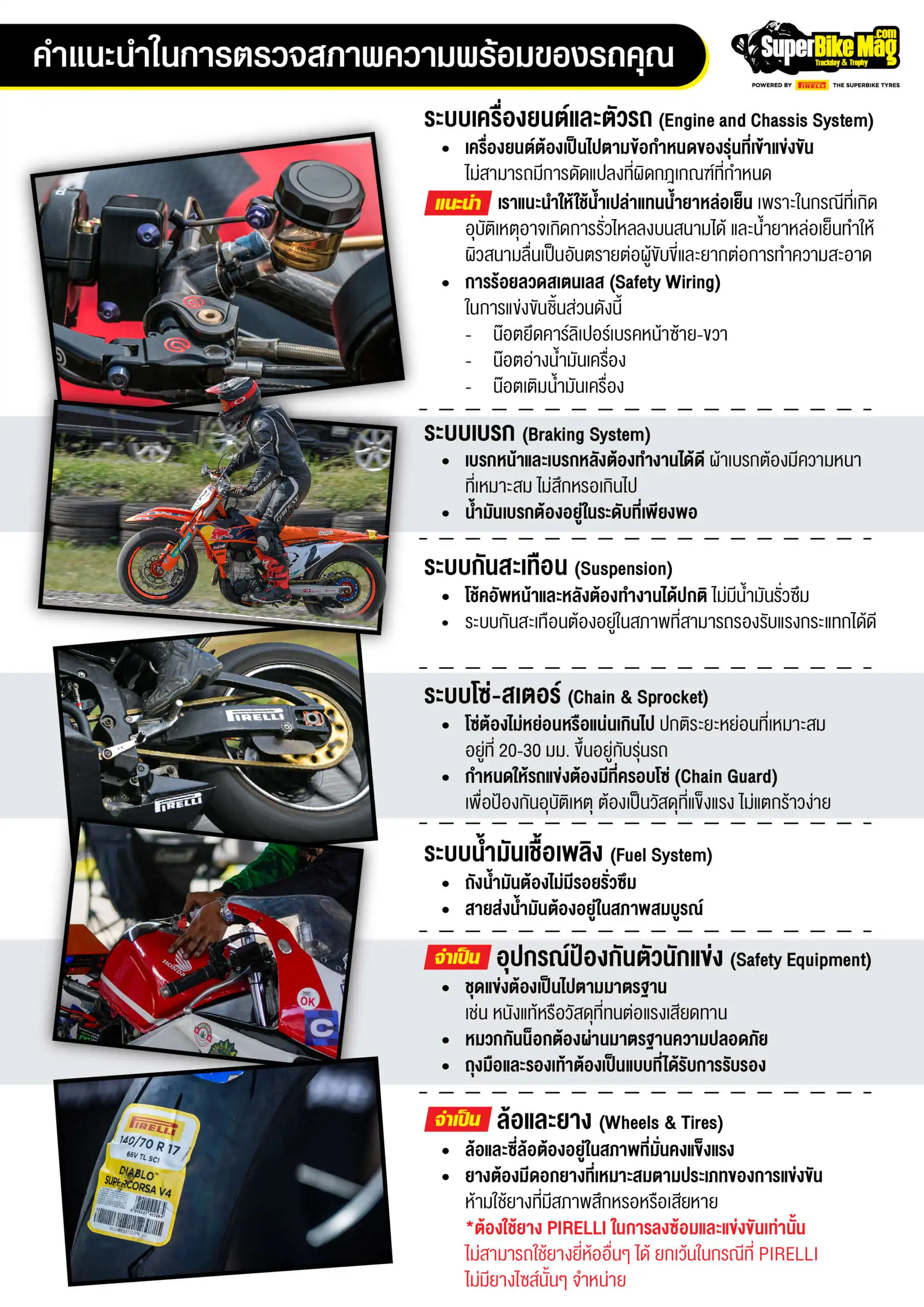 • เพื่อให้เป็นไปตามข้อกำหนดด้านเทคนิคและความปลอดภัยของการแข่งขัน รวมถึงการรักษามาตรฐานเดียวกันสำหรับผู้เข้าร่วมทุกคน นักแข่งจะต้องใช้ยางยี่ห้อ Pirelli ในการฝึกซ้อมวันศุกร์ (Practice) การขับขี่ในวันเสาร์ (Track Day/Qualifying) และ การแข่งขันวันอาทิตย์ (Race) เท่านั้น *ยกเว้นในกรณีที่ Pirelli ไม่มียางไซส์นั้นๆ จำหน่าย