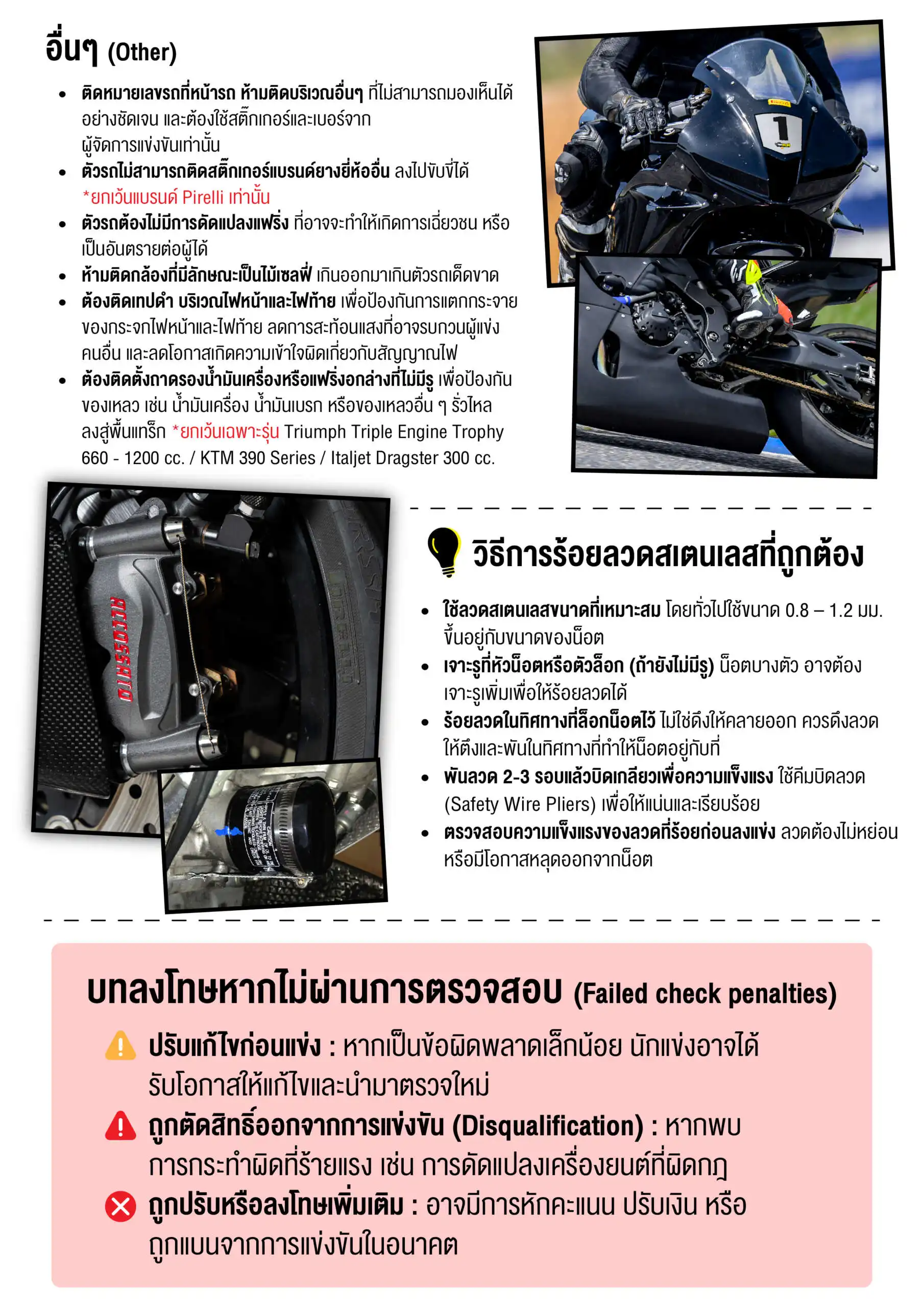 • ตัวรถต้องไม่มีการดัดแปลงแฟริ่งที่อาจจะทำให้เกิดการเฉี่ยวชน หรือเป็นอันตรายต่อผู้อื่นได้