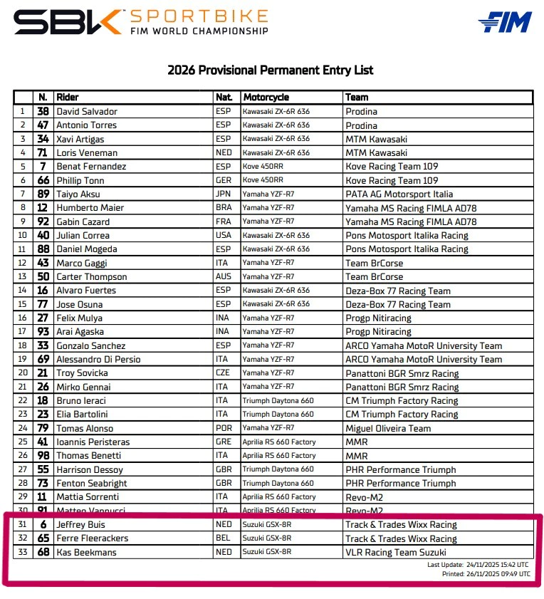 ค่ายคนเดือดเตรียมกลับเข้าสู่การแข่งขันอีกครั้งในปี 2026 หลังห่างหายไปพักใหญ่ทีเดียว โดยคราวนี้เลือกเริ่มต้นบทใหม่ในคลาส World Sportbike Championship (WorldSPB) แทนที่จะลงตรงในรุ่นใหญ่ WSBK เหมือนในอดีต การกลับมาครั้งนี้ใช้รถสปอร์ตพิกัดกลางรุ่น GSX-8R ลงทำศึก ภายใต้ทีม VLR Racing Team Suzuki พร้อมไลน์อัปนักบิดดาวรุ่งอย่าง Jeffrey Buis แชมป์โลก WorldSSP300 สองสมัย และ Kas Beekmans ที่สร้างผลงานโดดเด่นในรายการสปอร์ตไบค์ระดับประเทศมาก่อนหน้า ทำให้การคัมแบ็กของ Suzuki ถูกจับตามองอย่างมาก