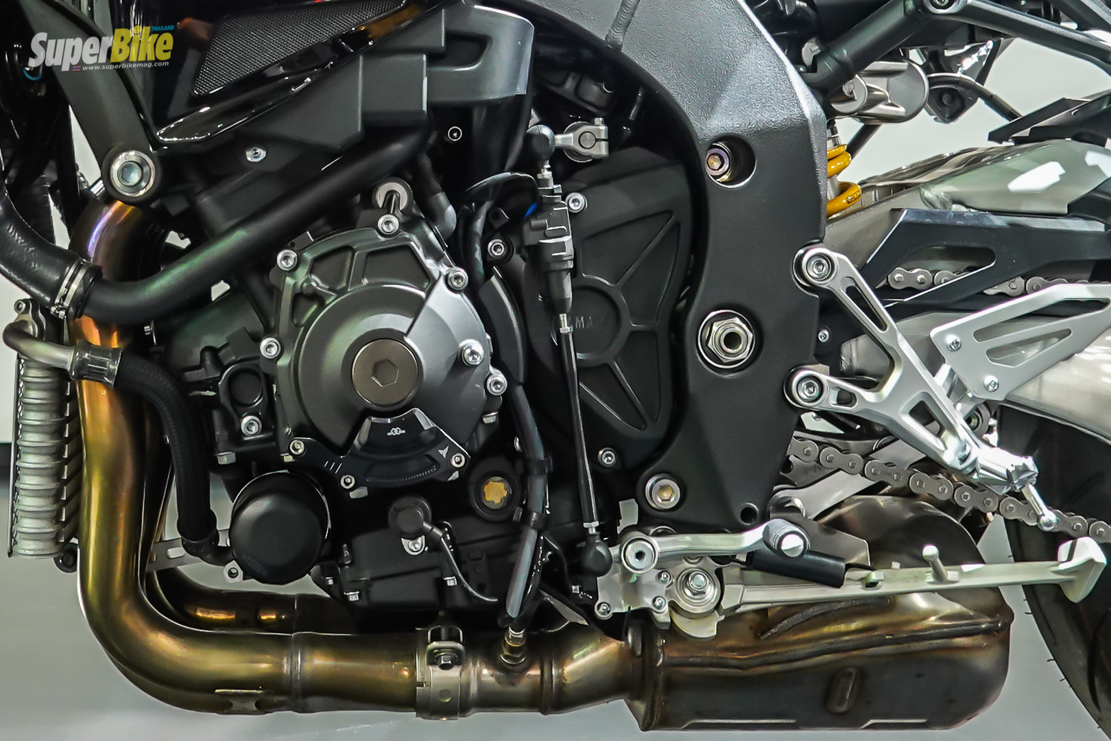 มาดูที่เครื่องยนต์ 4 สูบ Crossplane ขนาดความจุ 998 ซีซี ที่เป็นเอกลักษณ์เฉพาะของทางยามาฮ่า ให้กำลังแรงม้าที่ 158 แรงม้าที่ 11,500 รอบ/นาที แรงบิดอยู่ที่ 111 นิวตันเมตร ที่ 9,000 รอบ/นาที มาพร้อมกับเกียร์ 6 สปีด สามารถใส่เกียร์ได้เลย ไม่ต้องกำคลัทช์เพราะมี Quick shifter