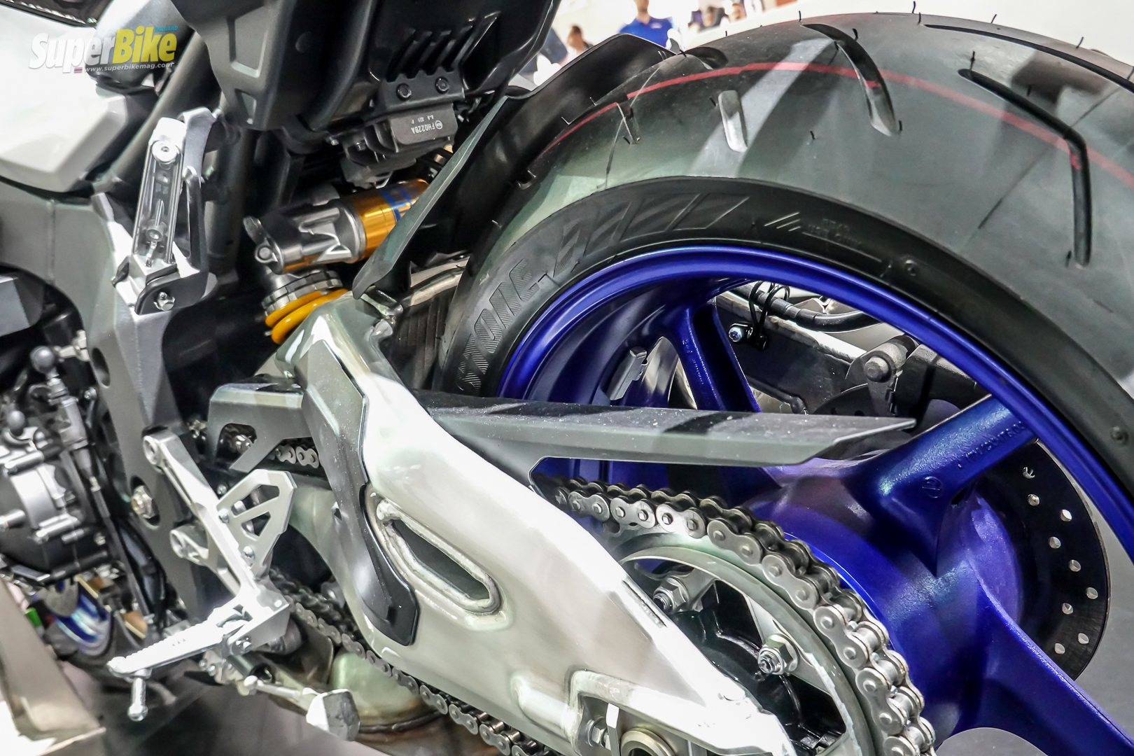 ช่วงล่างเอาของ Yamaha R1M มาใส่เลยก็ว่าได้ สำหรับโช้คหน้าไฟฟ้า Ohlins แบบ up-side down เส้นผ่าศูนย์กลางขนาด 43 มิลลิเมตร และโช้คหลังกึ่งไฟฟ้า Ohlins แบบ Subtank ที่ยึดอยู่ระหว่างเฟรมกับสวิงอาร์มแบบอลูมิเมียน น้ำหนักเบา