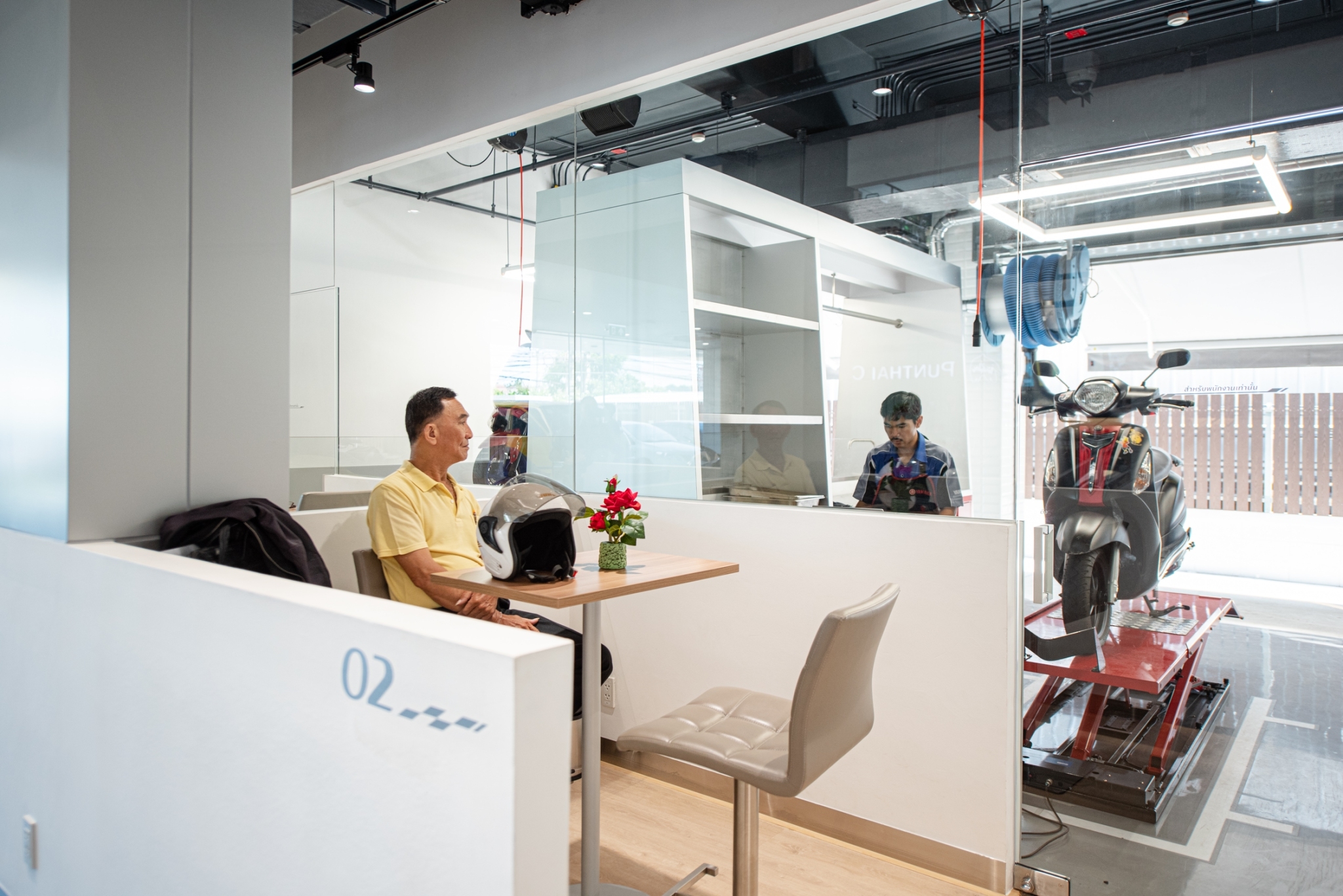 พร้อมล้างทำความสะอาดรถจักรยานยนต์และหล่อลื่นจุดหมุนต่างๆ ด้วยมาตรฐาน Premium Service หลังงานซ่อม โดยมีโซน Customer Semi-private lounge ให้ลูกค้าที่มาใช้บริการสามารถติดตามการเข้ารับการบริการรถจักรยานยนต์ของตนเองขณะที่ช่างทำการให้บริการได้อย่างใกล้ชิด และสามารถติดตามสถานะการซ่อมผ่านจอมอนิเตอร์และการสแกน QR code อีกด้วย