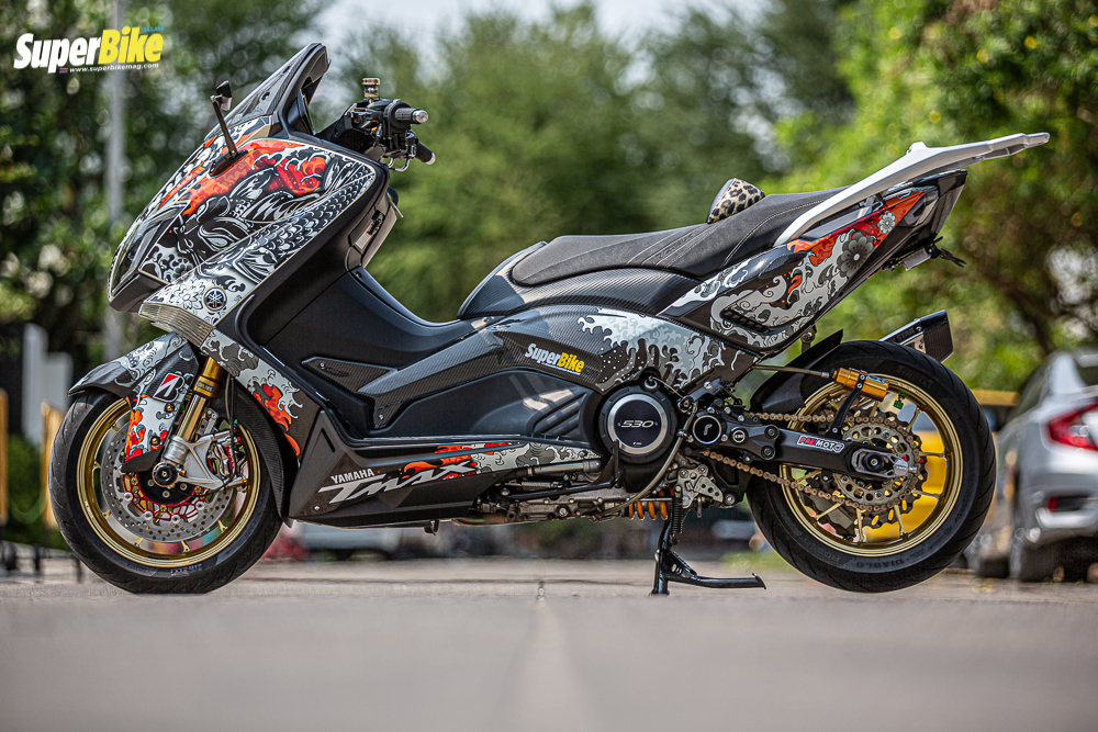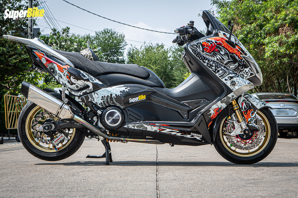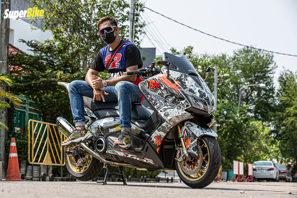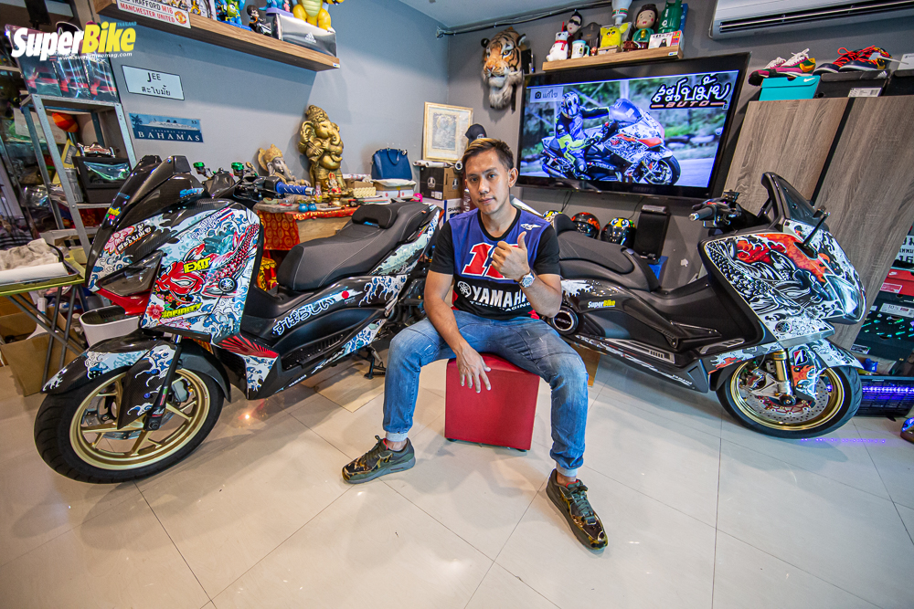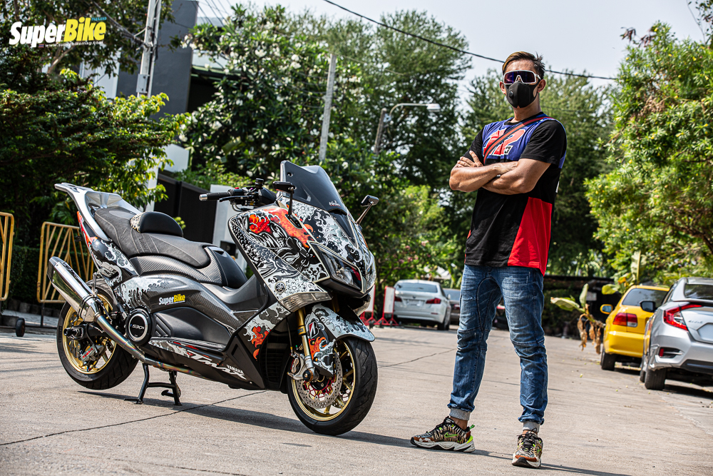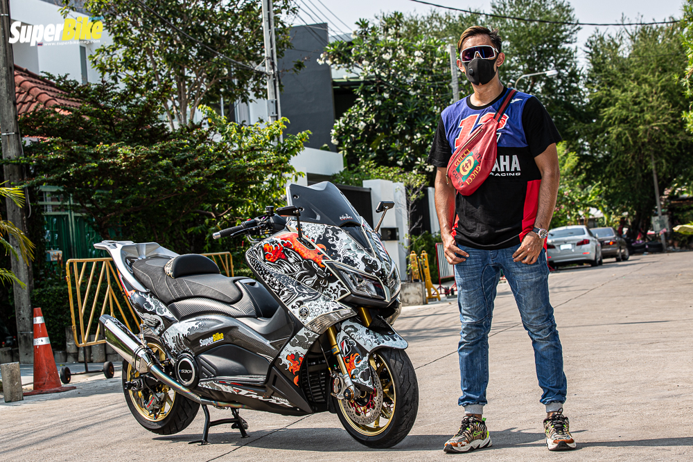 มาเข้าเรื่อง ในส่วนของรถกันบ้างนะครับ ต้องบอกก่อนเลยว่า รถคันแรกในชีวิตของผมเลย ผมขับ Kawasaki ninja zx 9 ครับ และก็ได้ฝันว่าอยากมี บิ๊กสกุ๊ตเตอร์สักคันหนึ่ง จนเวลาผ่านไป ก็ได้มาจับรถสกุ๊ตเตอร์จริงๆจังๆ จนมาเปิดร้าน ”สะโบมั้ย AUTO” เป็นร้านของผมเองเป็นร้านทำรถสกุ๊ตเตอร์โดยเฉพาะ อยู่ที่ซอยรัชดา 32 ส่วนรถสกุ๊ตเตอร์คู่ใจของผมในตอนนี้ ก็คือ เจ้า YAMAHA TMAX 530 ปี 2013 คันนี้นี่เองครับ