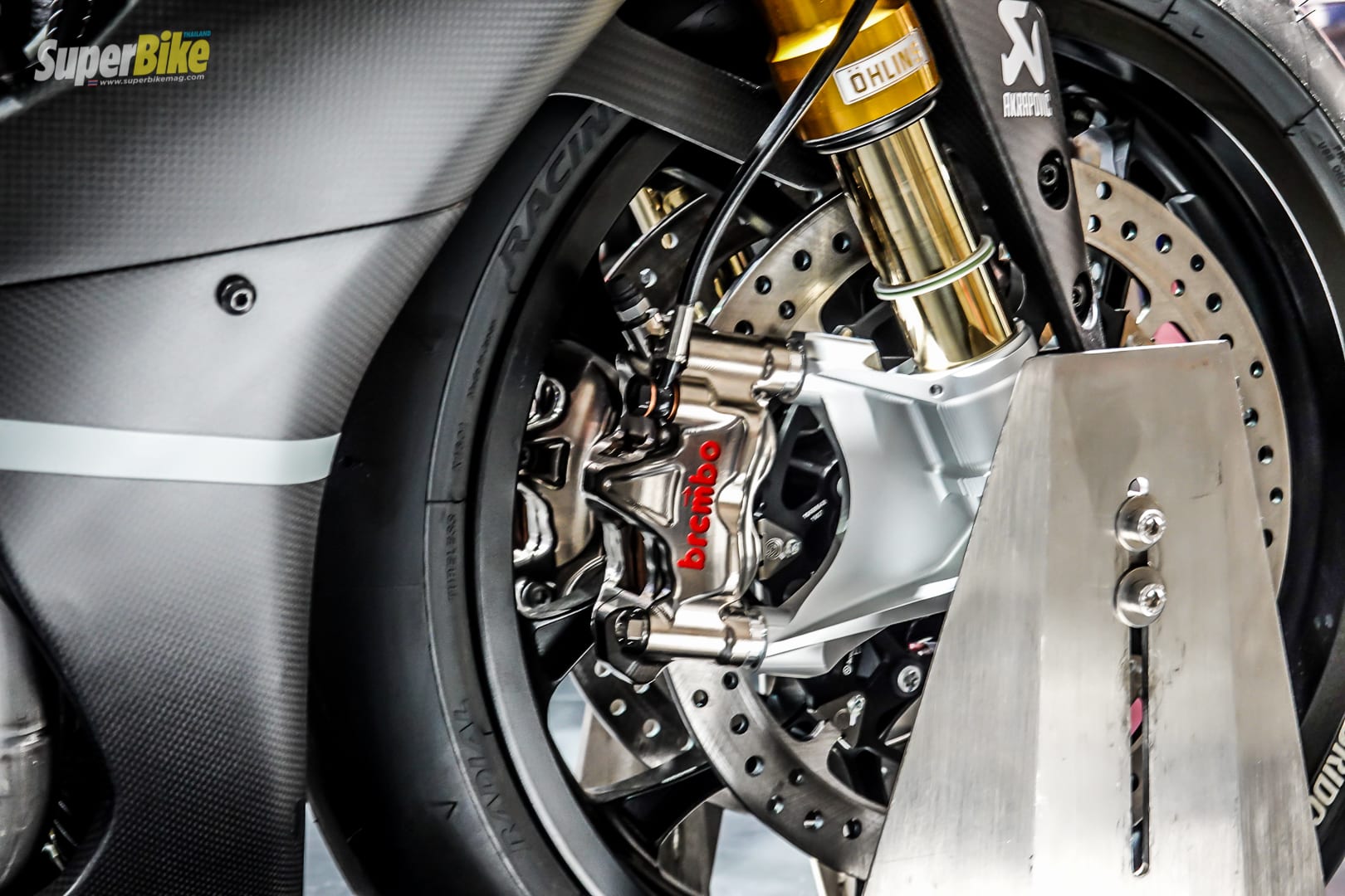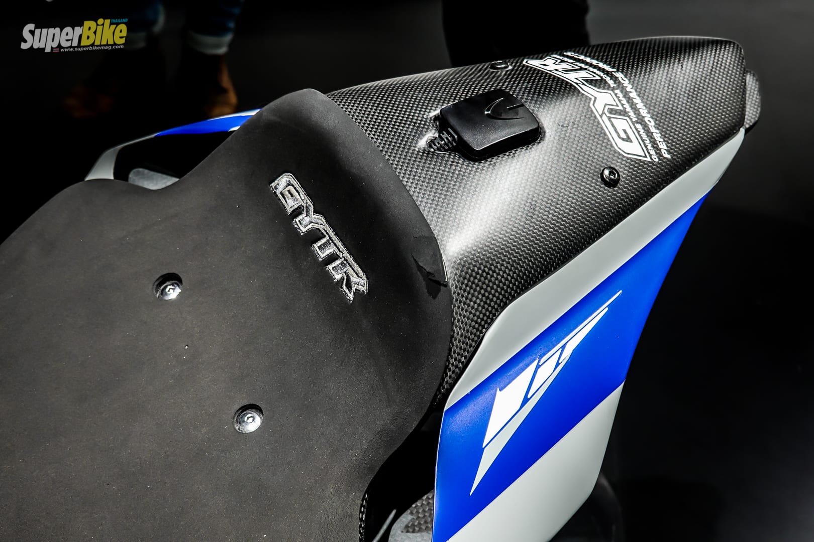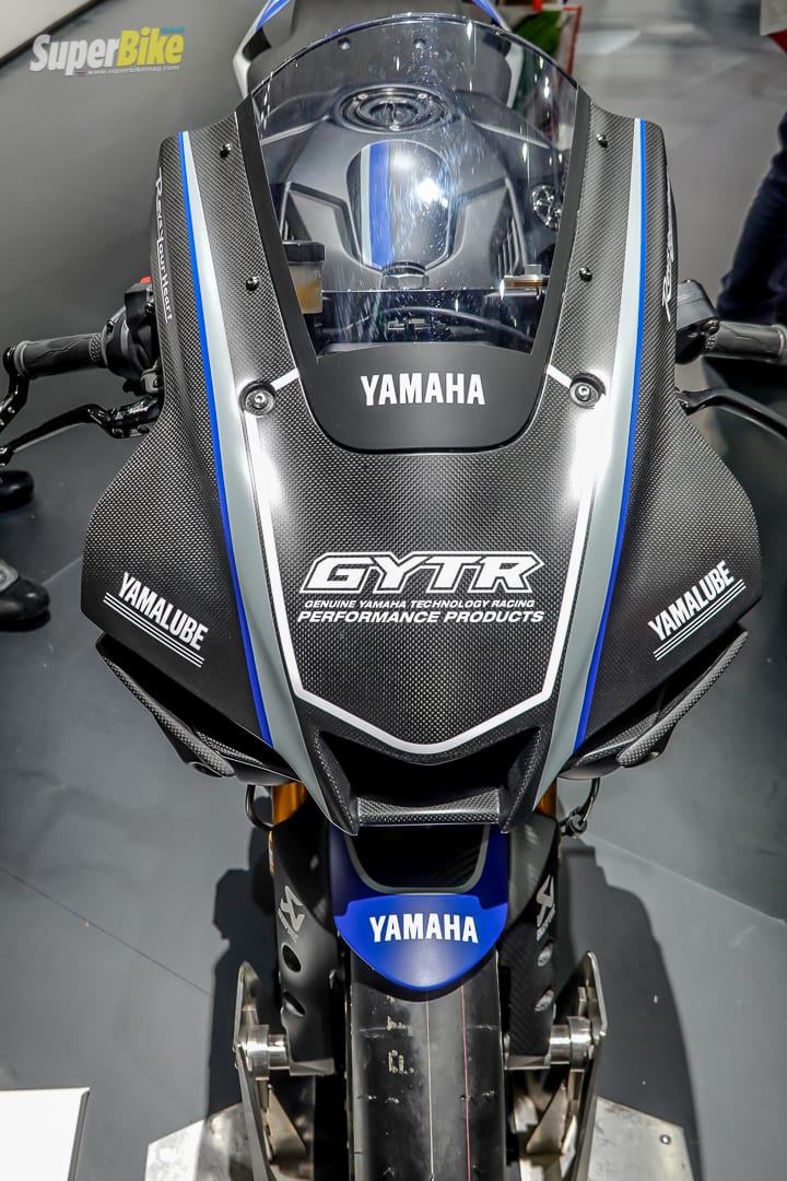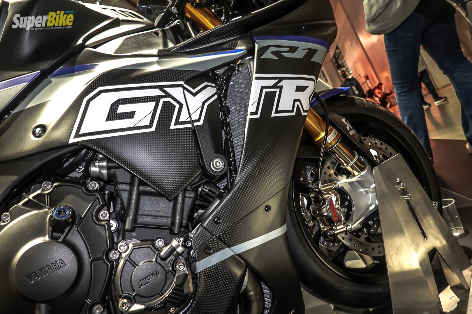 สำหรับ Yamaha YZF-R1 GYTR คันนี้ถูกปรับเปลี่ยนเป็นพาร์ทคาร์บอนเกือบจะทุกชิ้นเพื่อความเบา แข็งแรงและสวยงาม ถูกคาดด้วยลาย GYTR สีขาว-น้ำเงิน ดูดุลงตัว ถ้าสังเกตุไปที่ช่วงล่างด้านหน้าถูกปรับเปลี่ยนเป็นโช้คหน้า Ohlins และระเบรคแบบเรเดี้ยนเมาส์ตัว Racing จาก Brembo พร้อมจากเบรค Brenbo T-drive