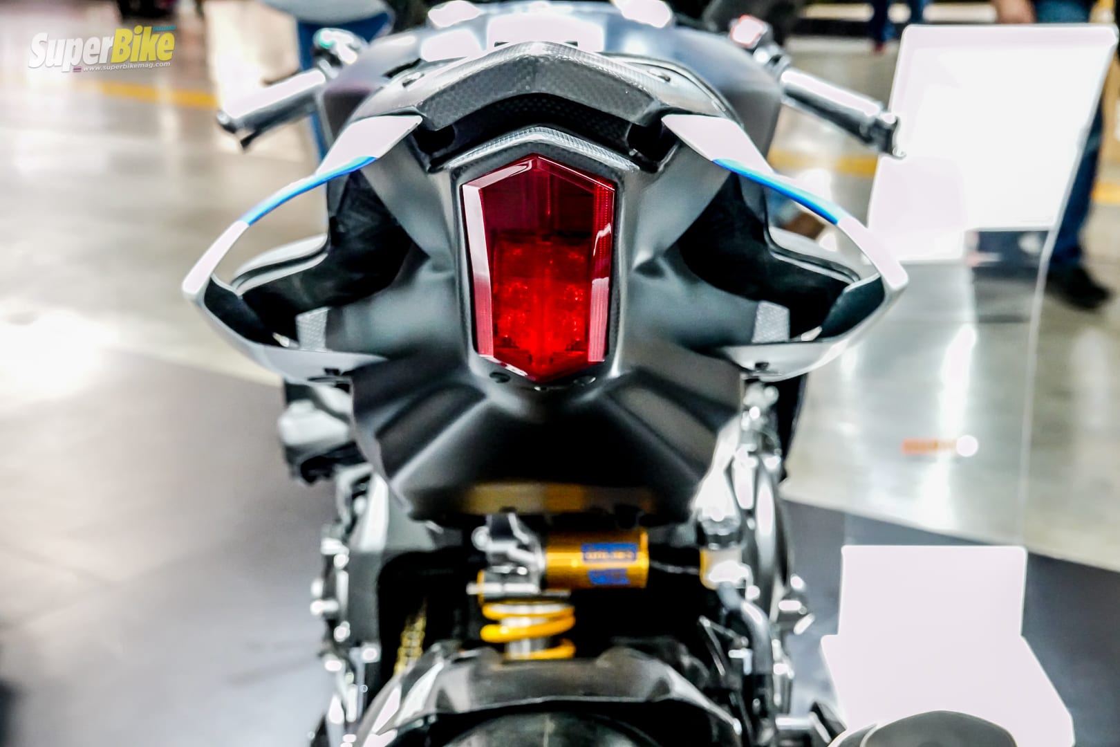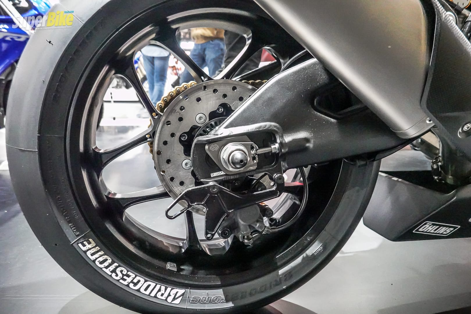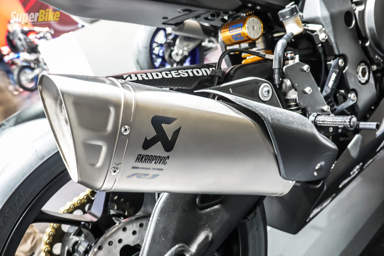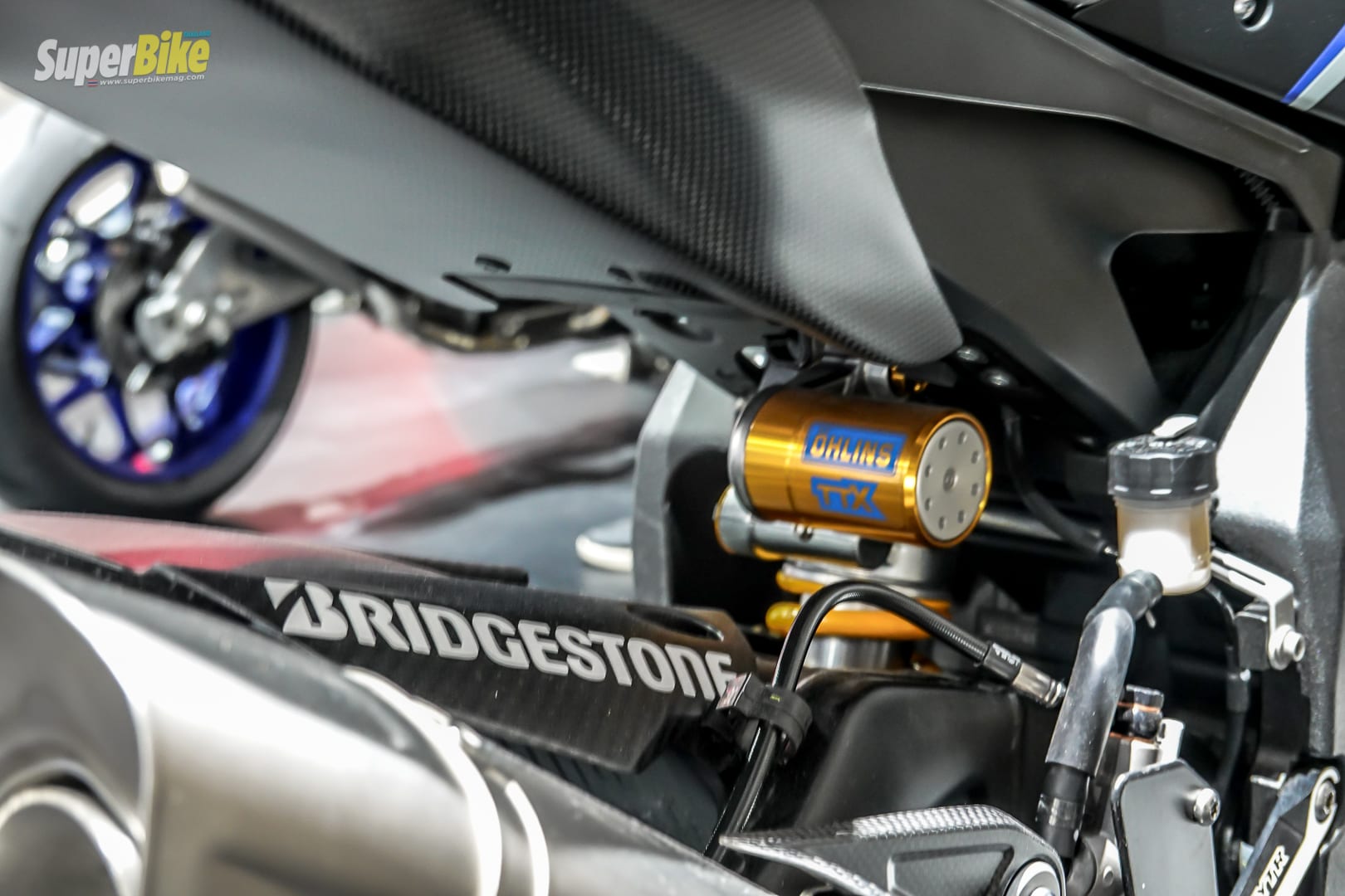 มาดูกันต่อที่ท่อไอเสีย Akrapovic ที่ถูกพัฒนามาเพื่อ R1 โดยเฉพาะกันเลย พร้อมกับโช้คหลัง Ohlins TTX ตัวท๊อปๆของทางค่ายอีกเช่นกัน ที่จะมาช่วยเสริมความเนียนในการเข้าโค้งให้ดียิ่งขึ้น