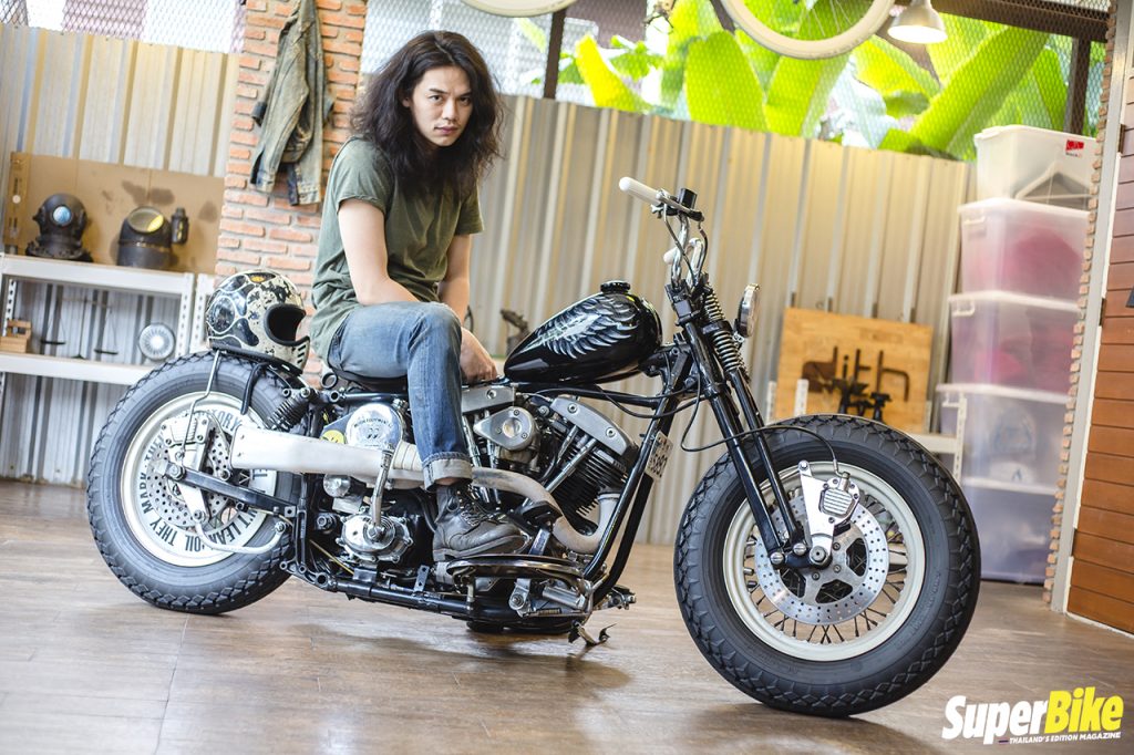 พอจาก fourty-eight มาก็มาเป็นคันนี้ครับกับ Harley Davidson Electra Glide Shovelhead จากปี 1975 ซึ่งอายุอานามมันมากกว่าตัวคนขับเสียอีกครับ (หัวเราะ) ซึ่งสภาพตัวรถจากเดิมที่ได้มาก็เป็นรถที่รื้อมาพอสมควรแล้วครับ คือเพรียวมาอยู่แล้ว ผมก็เอามาทำต่อ โดยเปลี่ยนล้อ เปลี่ยนถัง เปลี่ยนแฮนด์ เปลี่ยนไฟ ก็คือเปลี่ยนทุกอย่างให้เข้ากับสรีระของตัวผมเอง สำหรับแนวทางการคัสตอมของผม ไม่ได้มีการวางแพทเทิร์นอะไรไว้มากมาย โดยอยากให้รถออกมาดูเพรียว เรียบๆ แต่ก็ยังแฝงรายละเอียดต่างๆ ไว้อยู่ครับ อย่างพวกบังโคลนหลังก็เอามาตีใหม่แล้วยึดกับตัวล้อให้อยู่กับตัวล้อไปเลย ไม่อยากใช้คลัทช์มือก็เปลี่ยนไปเป็นระบบแบบคลัทช์เท้า เกียร์มือแทนซึ่งให้ความลำบาก(หัวเราะ) เอ้ย อารมณ์ไปอีกแบบ ตอนแรกๆ นี่ขี่ไม่เป็นเลยครับ ต้องมาปรับตัวกันใหม่ แต่พอเริ่มชินก็สนุกกับมันดีครับเวลาที่ได้เข้าเกียร์แต่ละเกียร์ แล้วก็เปลี่ยนเบาะเป็นเบาะเล็ก ถังเล็กอะไรแบบนั้น แล้วก็อัพไซส์ล้อให้ดูใหญ่ให้ขัดๆ กับตัวโครงรถรวมไปถึงยางสไตล์คลาสสิค ออกแนวๆ บ็อบเบอร์ครับ นอกจากนั้นก็จะมีท่อที่เป็นแบบสองออกหนึ่งครับ เพราะอยากได้ท่อที่เสียงทุ้มๆ แล้วก็ไปทำสีขาวให้แมทช์กับล้อและยางครับ