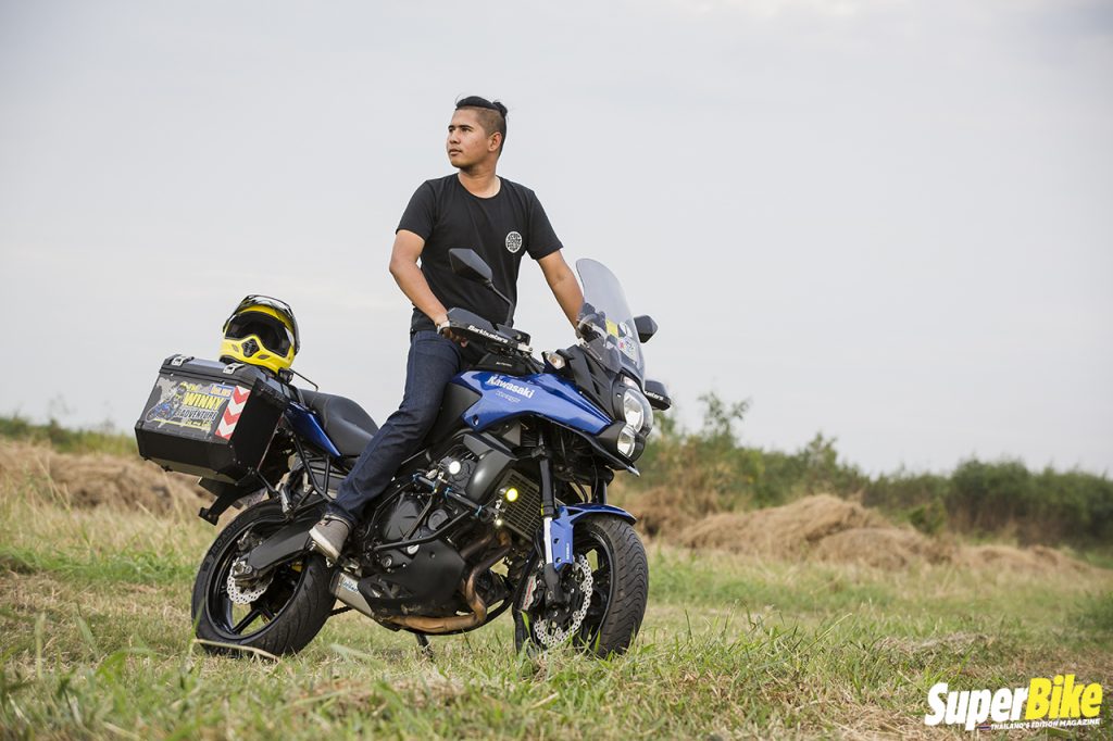 สวัสดีครับผมชื่อวิน ปวินท์ บูรภาค ครับ ความชอบในมอเตอร์ไบค์ของผมเริ่มต้นจากสมัยเด็กๆ ที่เวลาไปเที่ยวภาคเหนือ ตอนช่วงหน้าหนาวก็จะไปเห็นพี่ๆ เขาขับขี่บิ๊กไบค์ออกทริปกันมา ขี่ขึ้นดอยผ่านรถที่เรานั่งอยู่ไป ก็รู้สึกว่าเอ้ย! มันสวยดีนะเวลาขับขี่กันไปเป็นขบวนอะไรแบบนั้น ก็เริ่มชอบมาตั้งแต่ตอนนั้น แต่ถ้าเริ่มมาขี่จริงๆ จังๆ ก็จะได้ราวๆ 6 ปีครับ คันแรกของผมเองเลยจะเป็น Honda CB400 super four tech 3 ก็เก็บตังค์ซื้อมาครับ เป็นรถอินวอย ทะเบียนอะไรก็ไม่มี ขี่ไปขี่มา เรารู้สึกว่ารถ super four เนี่ยไม่ใช่แนวของเราอะไรแบบนั้น ก็เลยคิดเปลี่ยนรถ โดยเปลี่ยนมาเป็น Kawasaki Versys 650 ปี 2014 โดยเหตุผลที่เลือกก็เพราะว่า คิดว่ารถในสไตล์แอดเวนเจอร์-ทัวริ่ง เนี่ยน่าจะเหมาะกับตัวผมเองมากกว่า เหนื่อยเวลาขับขี่ท่องเที่ยวน้อยลง ไม่ต้องสู้ลมเหมือนขับ super four บรรทุกสัมภาระอะไรได้มากกว่า ซึ่งทำให้เราอยากที่จะขับขี่ท่องเที่ยวมากขึ้นๆ เรื่อยๆ ครับ ส่วนเหตุผลที่เป็น Versys ก็เพราะว่าตอนนั้นเห็นคนขับ Versys นี่ละครับขับผ่านไปมีปี๊บติดสองใบ เห็นแล้วรู้สึกแบบชอบมากๆ