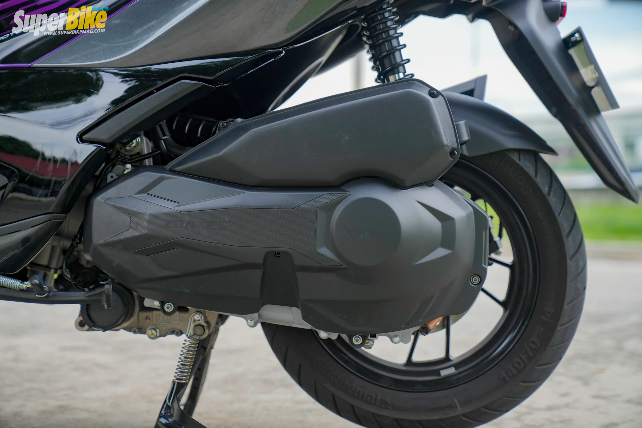 ช่วงล่างถือว่าทำออกมาได้ตรงตามโจทย์สำหรับขี่ในเมือง โช้คหน้าเทเลสโคปิก โช้คหลังสปริงคู่ เพียงพอต่อการใช้งาน ฟีลลิ่งโดยรวมให้ความนุ่นนวลเป็นมาตรฐานเหมาะสำหรับสายขับขี่ใช้งานทั่วไปมากกว่าสายเพอร์ฟอร์แมนซ์เท้าหนัก ซึ่งใครเป็นสายโมดิฟายสามารถนำไปต่อยอดได้ครับ ส่วนระบบเบรกกับคาลิเปอร์ 4 พอตจาก J.Juan ของสเปนทำได้ดีซึ่งเป็นสเปคเดียวกันที่ใช้กับ Zontes ทุกรุ่นและออกมาเป็นเสียงเดียวกันว่าเอาเรื่องทีเดียว สำหรับขนาดล้อ 15 – 14 นิ้ว ยางไซส์ เป็นไซส์มาตรฐานหาซื้อมาเปลี่ยนได้ตามท้องตลาดทั่วไป